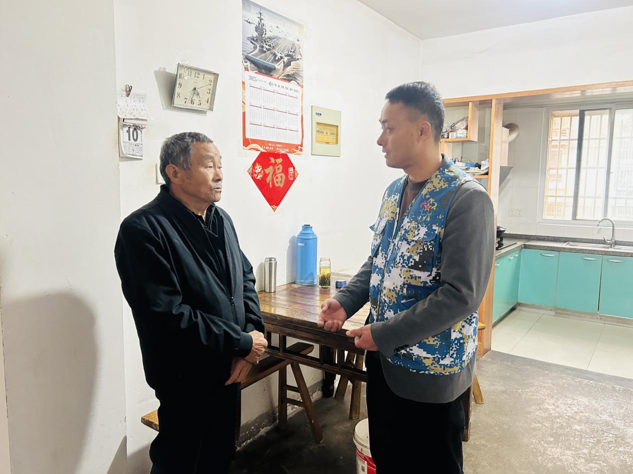 走访慰问暖老兵,精准排查除隐患。培训结束后,社区工作人员与平安志愿者组成走访小组,专程前往退役老兵家中开展安全走访与关怀慰问。走访人员与老兵亲切交谈,关切询问生活与健康状况,送上诚挚问候。同时全面检查家中电器设备、燃气管道、开关插座等,针对线路老化、插座松动等隐患现场给出整改建议,耐心讲解安全用电用气常识,用实际行动守护老兵晚年安全。