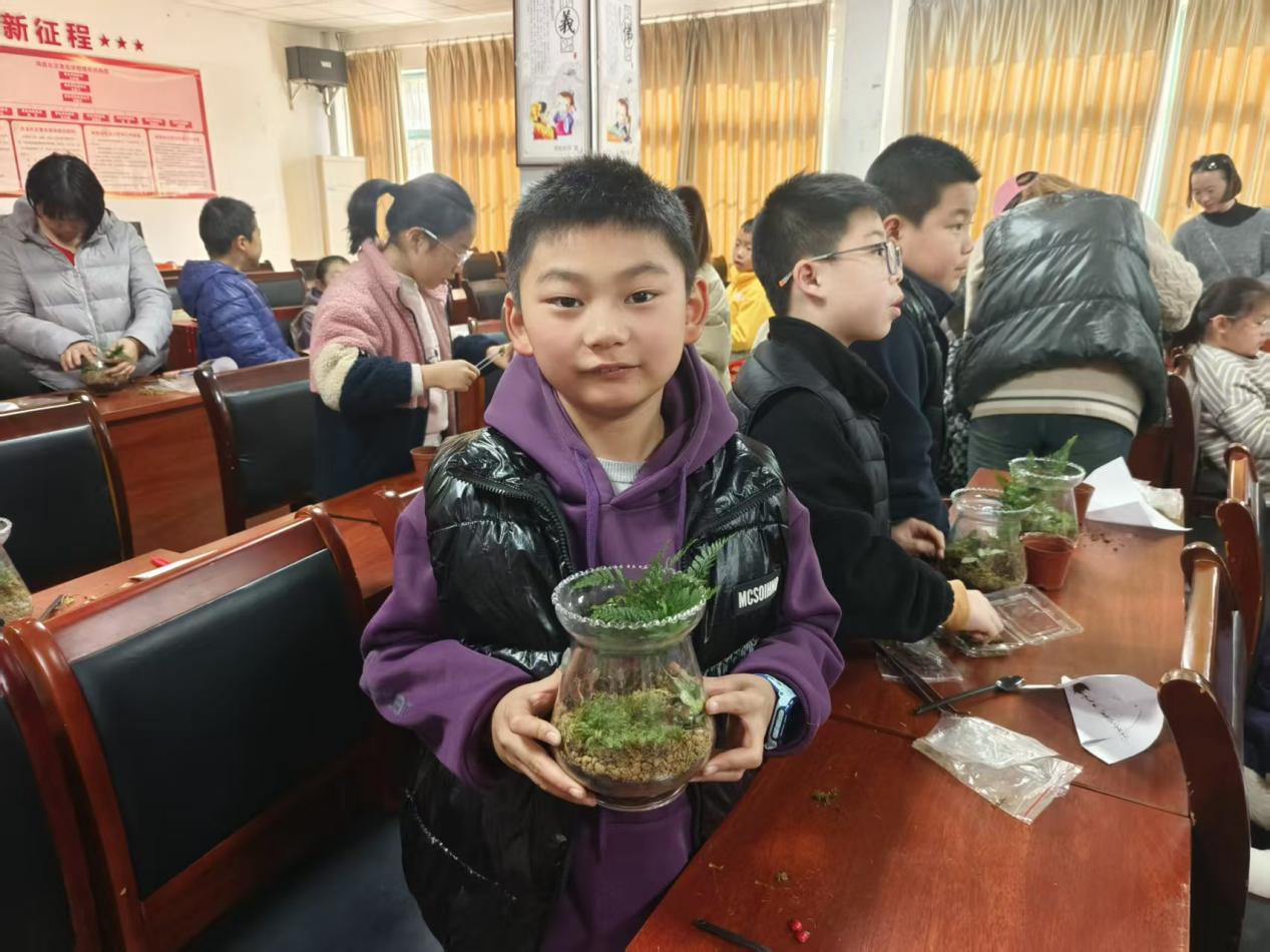随后,指导老师详细讲解了微景观的制作步骤与养护知识。在实践环节,家长们在旁细心协助,孩子们兴致勃勃地动手操作——先铺设营养土并轻轻压实,再倒入专用泥土,细心修剪植物根须,将一棵棵小植物栽种进容器,确保根部被土壤完全覆盖。接着进入创意美化阶段,大家用苔藓、干草等材料自由装点,打造出各具特色的微缩景观。小兔子、小栅栏等趣味摆件更让一个个场景生动起来,有的孩子还构思出“小兔采蘑菇”“池塘边喝水”的田园故事。
