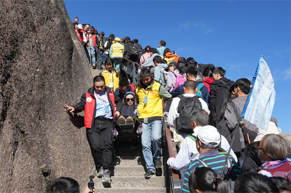 当日清晨,残友们乘坐大巴抵达黄山风景区,再换乘缆车向山间进发。在通往玉屏楼景区的攀山步道上,志愿者们分工协作:有的俯身稳稳推扶轮椅,有的贴心递上温水与补给,有的在坡道处合力托举,用专业与温暖扫清前行障碍。
