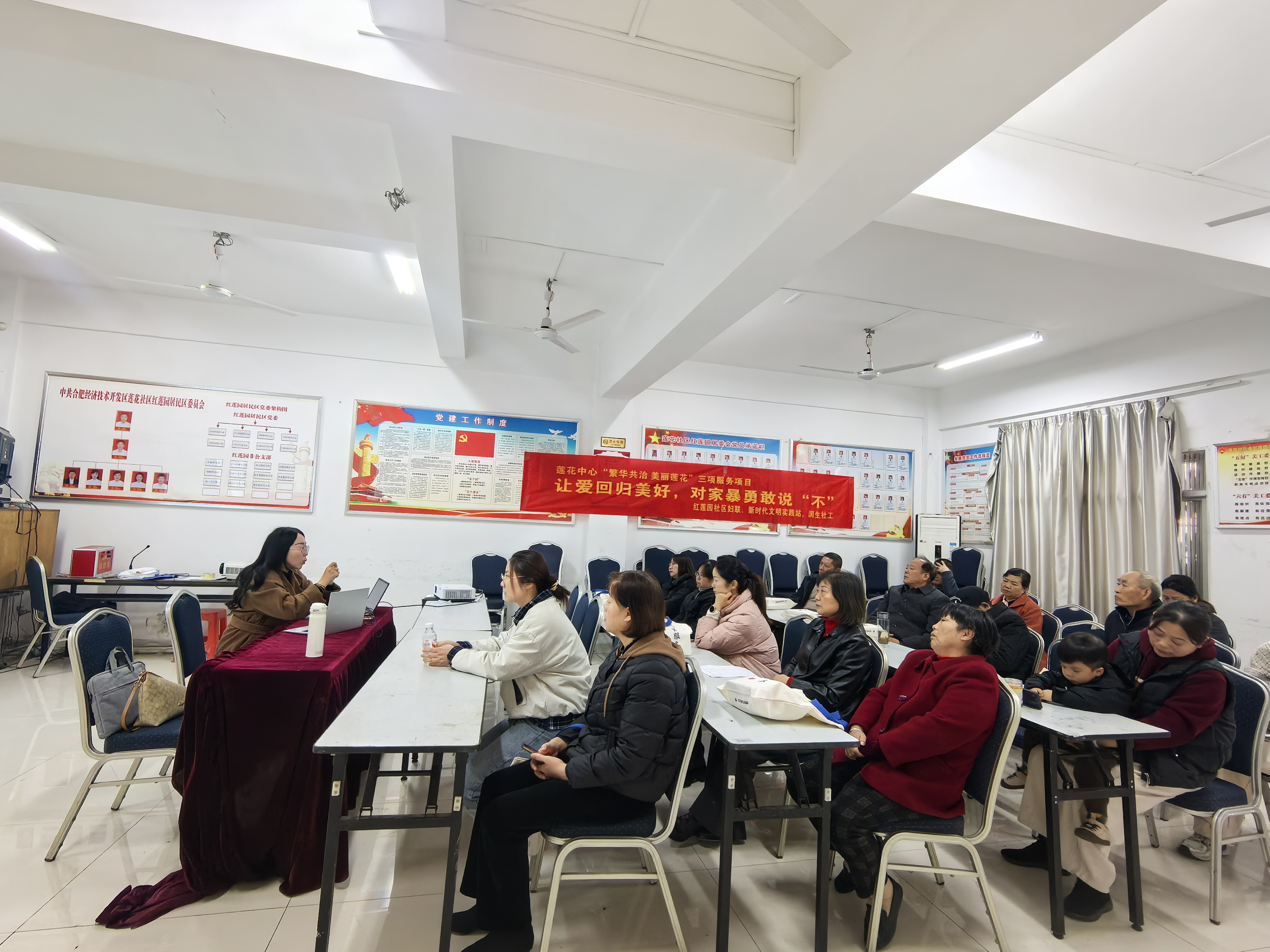 家庭是国家发展、民族进步、社会和谐的重要基石。在11月25日“国际消除对妇女暴力日”来临之际,为从源头上预防和减少家庭暴力现象,筑牢家庭安全的“第一道防线”,11月21日下午,合肥市红莲园社区妇联在社区二楼活动室开展“让爱回归美好,对家暴勇敢说‘不’”主题宣传活动。此次活动旨在将法治思维与人文关怀深度融合,不仅提升了社区居民的维权能力,更营造了反对暴力、共建平安家庭的浓厚社会氛围。