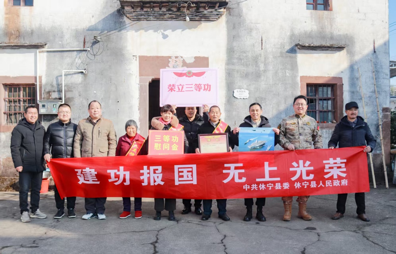 12月26日,休宁县退役军人事务局、人武部、及渭桥乡退役军人服务站工作人员组成送喜报队伍,带着三等功喜报、慰问金,来到现役军人金明同志家中,将这份属于军人的荣耀与地方的关怀送到军属手中,让“一人立功,全家光荣”的荣光照亮乡村。