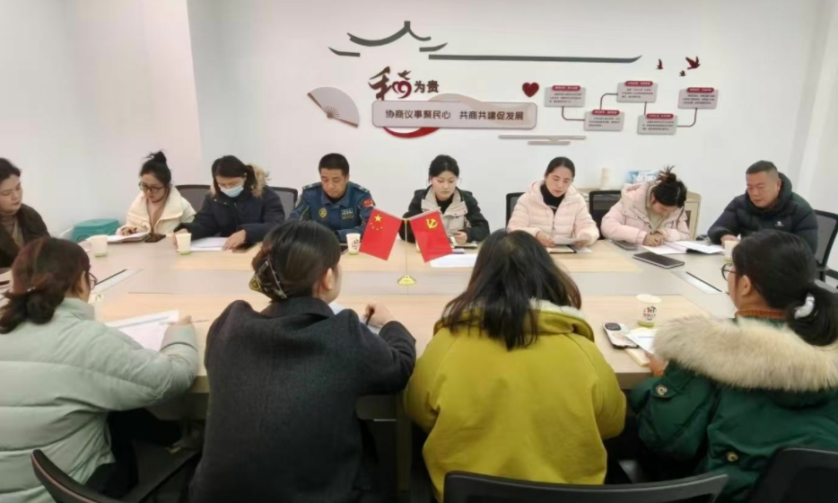 (图为社区工作人员与共建单位共同回顾2025年共建情况)