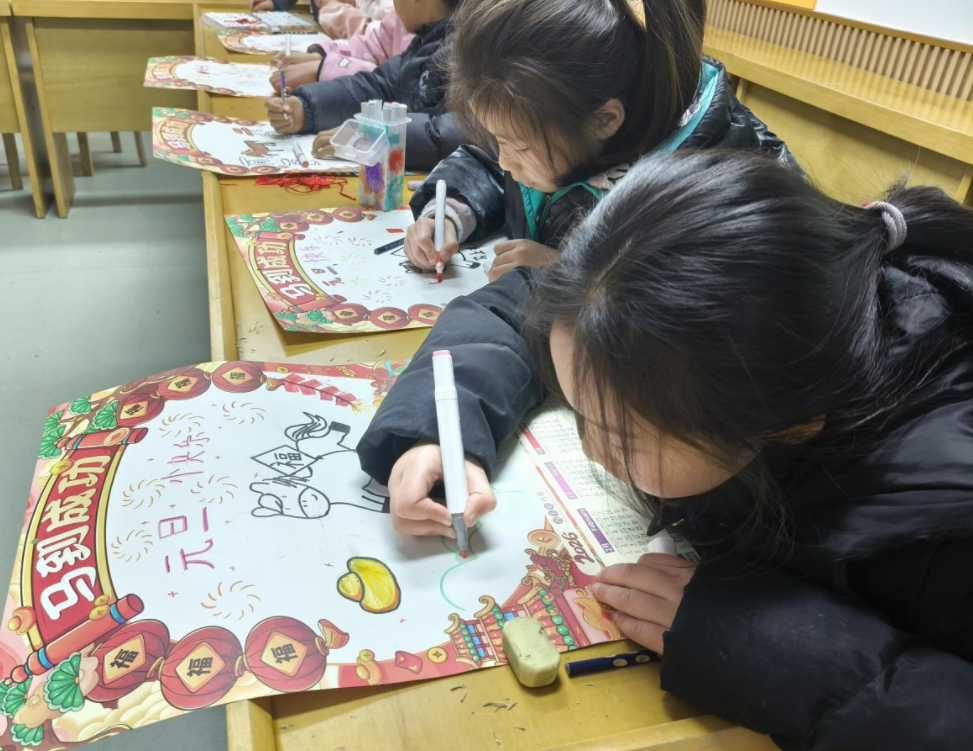 随后,最受期待的元旦挂历DIY制作环节正式开启。志愿者提前准备了空白挂历、水彩笔、马克笔、剪纸等丰富材料,孩子们在志愿者和家长的指导下,兴致勃勃地投入创作。大家充分发挥想象力,有的选择绘制喜庆的红灯笼、吉祥的龙年图案,有的用鲜艳色彩勾勒烟花、雪花等冬日元素,更有孩子将“新年快乐”“阖家幸福”等新年祝福融入作品之中,一笔一画勾勒专属自己的新年挂历。创作过程中,志愿者不时驻足指导,鼓励孩子们大胆创意表达,耐心解答创作难题,引导孩子们在动手实践中感受手工制作的乐趣,增强对传统节日的情感联结。