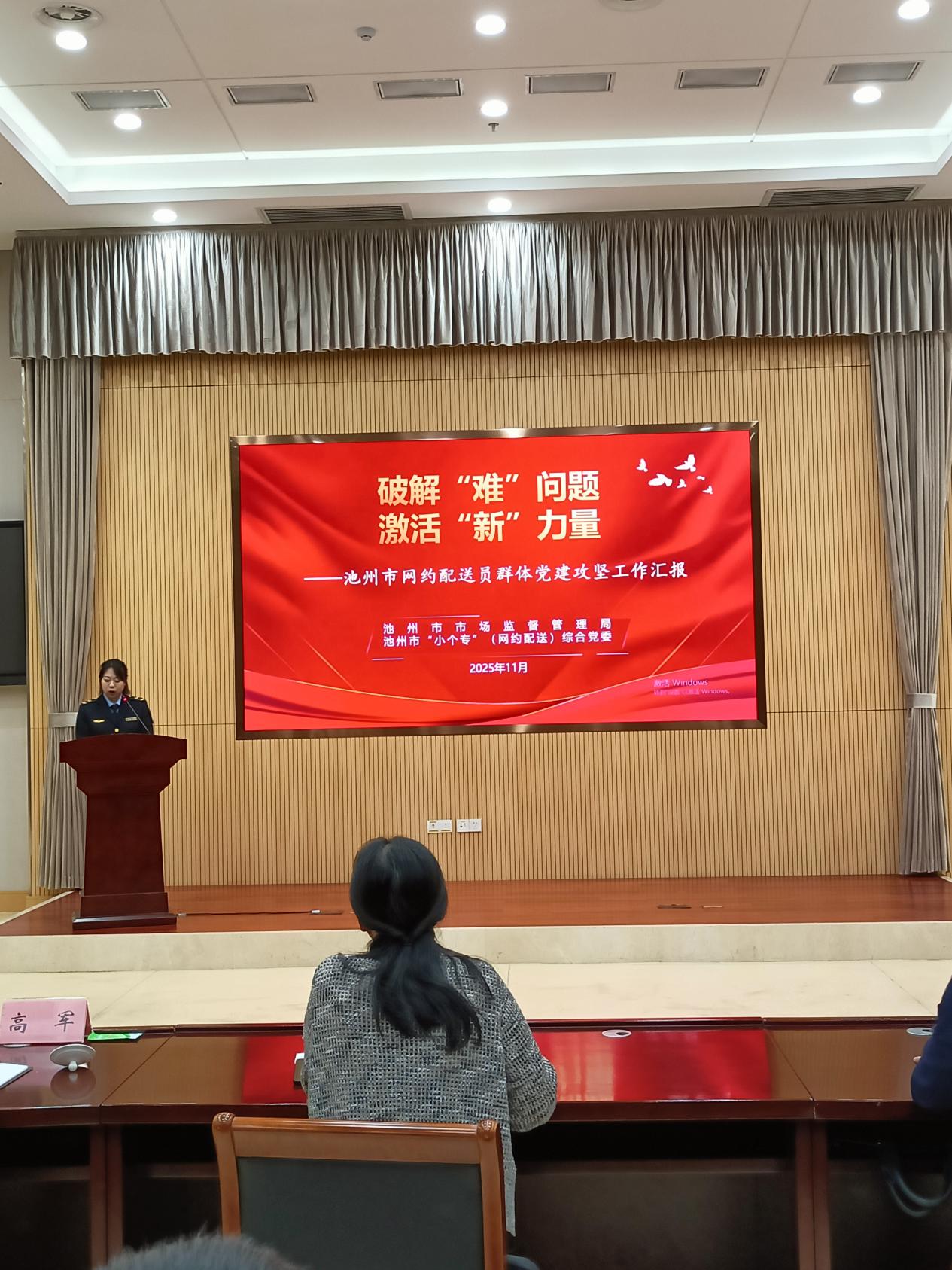 11月12日,在池州市委社会工作部召开的2025年新兴领域党建工作攻坚试点项目成果评审会上,池州市市场监管局、市“小个专”(网约配送)综合党委的“破解‘难’问题,激活‘新’力量——池州市网约配送员群体党建攻坚项目”荣获全市行业党委评分第一名。