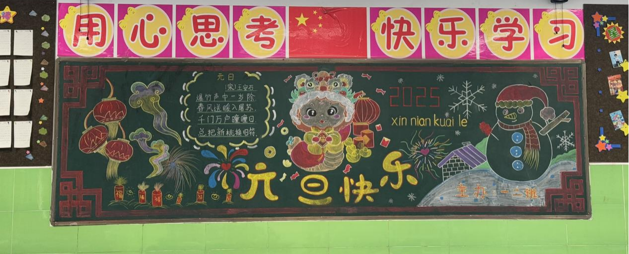 为庆祝即将到来的2025年,学校各班围绕“庆元旦”主题精心设计,用鲜艳的色彩和生动的文字,将黑板报装点得五彩斑斓、充满生机。老师和学生积极参与,充分发挥自己的特长,集思广益,精益求精,精心设计,从色彩搭配到排版的布置,再到内容编辑,无不凝聚了他们的汗水与智慧。内容丰富、主题鲜明、创意十足的黑板报也为2025年元旦节日的到来,营造了喜庆的气氛,不仅充分彰显班级文化特色和精神风貌,也倾注了同学们对新一年美好未来的憧憬和祝愿。