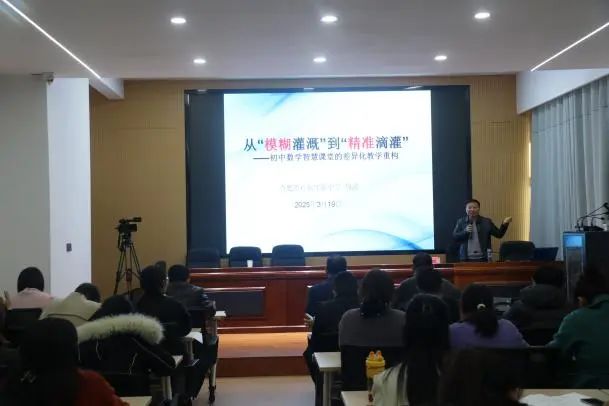 活动的最后内容,由课题主持人合肥市行知实验中学校长周武以《从“模糊灌溉”到“精准滴灌”》为题作专题报告。他深入剖析当前初中数学教学面临的三大困境——学情反馈滞后、分层标准模糊、资源匹配低效,并结合课题研究成果,系统阐述了智慧课堂在精准教学中的核心作用。周校长强调,依托大数据分析技术,教师可实现学情实时诊断、资源精准推送及教学策略动态优化,从而突破传统课堂的局限。此外,他还分享了合肥市行知实验中学在智慧课堂建设中的典型案例,为与会教师提供了宝贵的实践经验与改革思路。