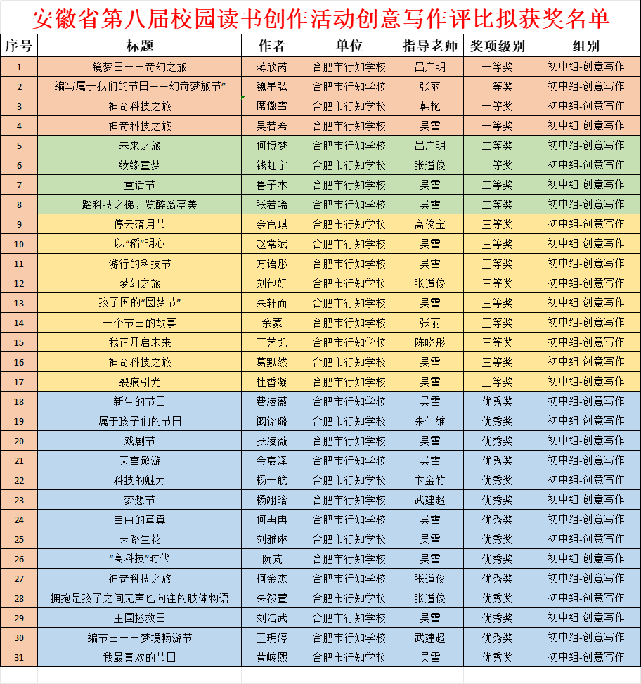 本届活动以“书香浸润心灵,笔墨书写成长”为主题,由安徽省教育厅主办,旨在激发青少年阅读兴趣、提升文学创作能力。活动吸引了全省数千所学校师生参与,竞争激烈。合肥市行知学校在此次活动中表现亮眼,共斩获一等奖4人、二等奖4人、三等奖9人,优秀奖14人,获奖作品涵盖散文、诗歌、读书笔记等多个类别。
