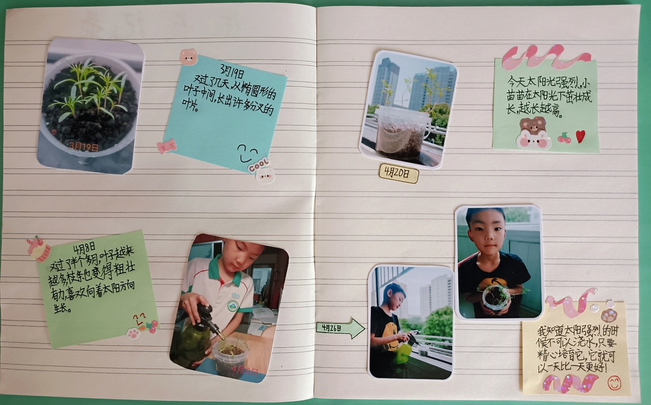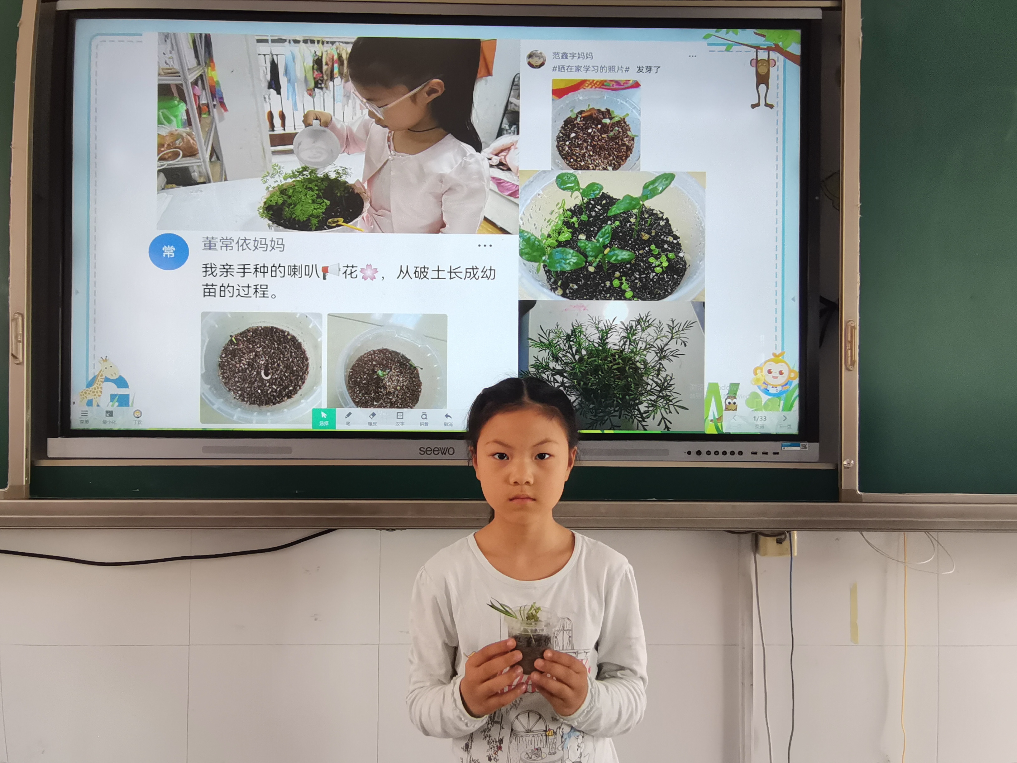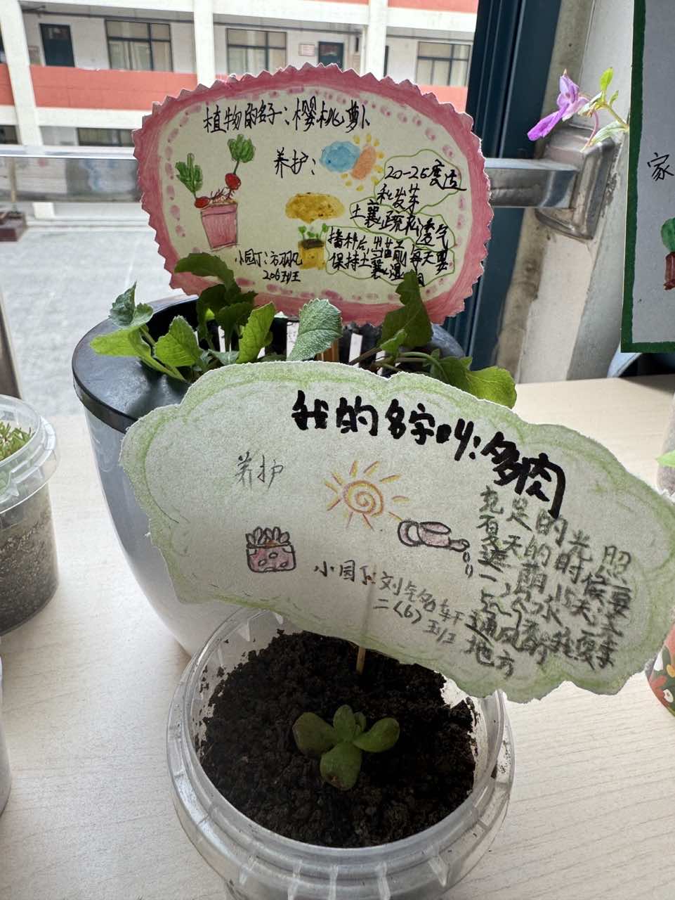 种下种子后,经过一个多月的精心呵护,不少种子都已经长成了小苗苗,有的学生给小苗苗进行了分盆,有的学生把自己的种植过程写成了观察日记,还有的学生给小苗苗写好养殖小卡片,在老师的号召下,孩子们纷纷把自己的辛苦种植的“杰作”带来班级分享,各班级还评选出“种植小能手”。