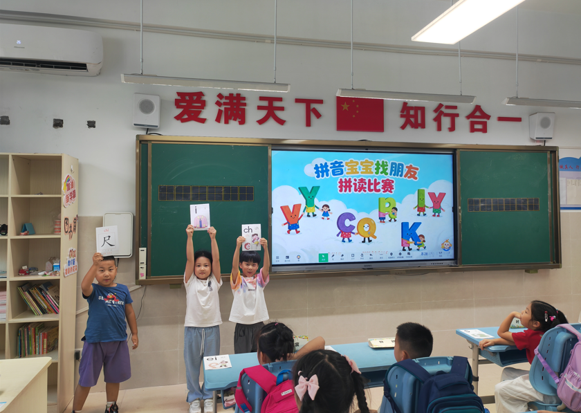 一年级组开展了“拼音宝宝找朋友”拼音趣味实践活动。老师将拼音卡片分发给学生,让大家手持“声母”“韵母”卡片,寻找能组成音节的“朋友”。孩子们在教室中穿梭,兴奋地呼唤“b和a是朋友,能拼成bā”,在互动中快速掌握拼音拼读规则,又夯实了普通话发音基础,让推普融入低年级学习,助力学生说好普通话。