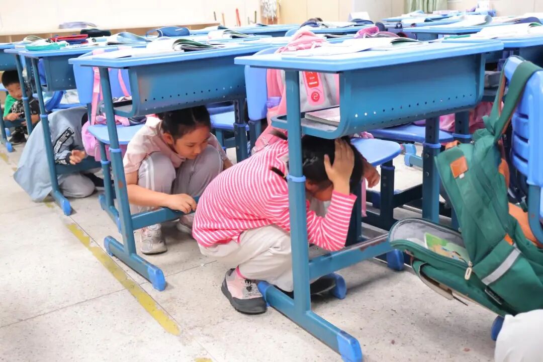 上午9时整,预先警报准时响起,演练正式启动。教室内,学生们迅速放下手中书本,在班主任的引导下,双手紧紧抱头、弯腰蹲于课桌下方,将身体蜷缩成“防护姿势”,避免头部、腹部受到撞击。