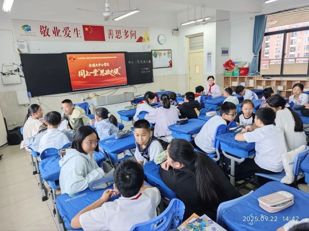 这堂思政大课的内容引发了师生的强烈共鸣。当视频中讲到郁达夫以笔为枪鼓舞士气、冼星海的《黄河大合唱》吼出民族魂魄、无数民众修筑滇缅公路、各界人士支援前线时,老师适时提问:“国歌里的‘万众’指的是谁?”孩子们争相回答:“是军人!”“是工人、农民!”“还有艺术家和商人!”“是每一个为抗战出力的中国人!”这些稚嫩而坚定的声音,传递出他们对“众志成城”的初步理解。全国抗日根据地军民团结互助、共御外敌的故事,更让这份理解沉淀为真实的感动。