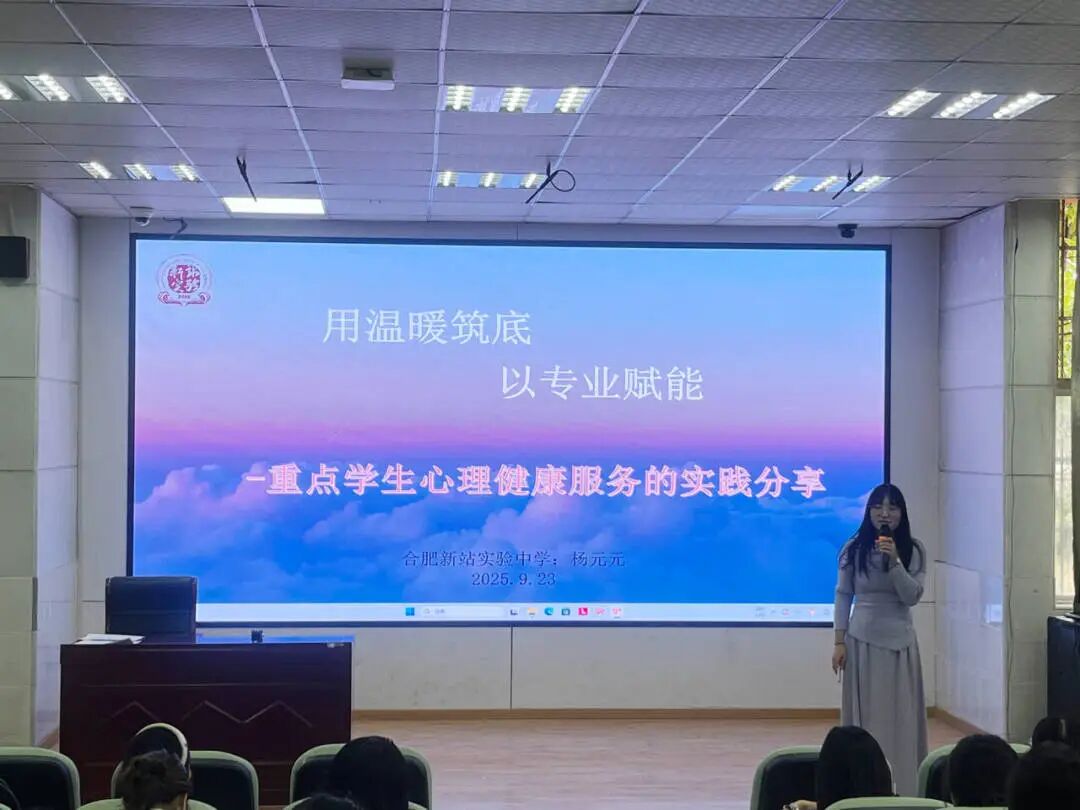 在经验分享环节,合肥新站实验中学杨元元老师围绕“如何服务好重点学生”进行了交流。她指出,学校心理健康工作应以预防为先,主动干预远胜于被动应对。通过系统化的预防与干预措施,能有效降低危机事件发生概率。杨老师还结合实际,介绍了如何开展特殊群体学生的摸排与数据收集工作,并分享了运用现代办公软件提升心理健康工作效率的实用方法,为参会教师提供了可操作的借鉴。
