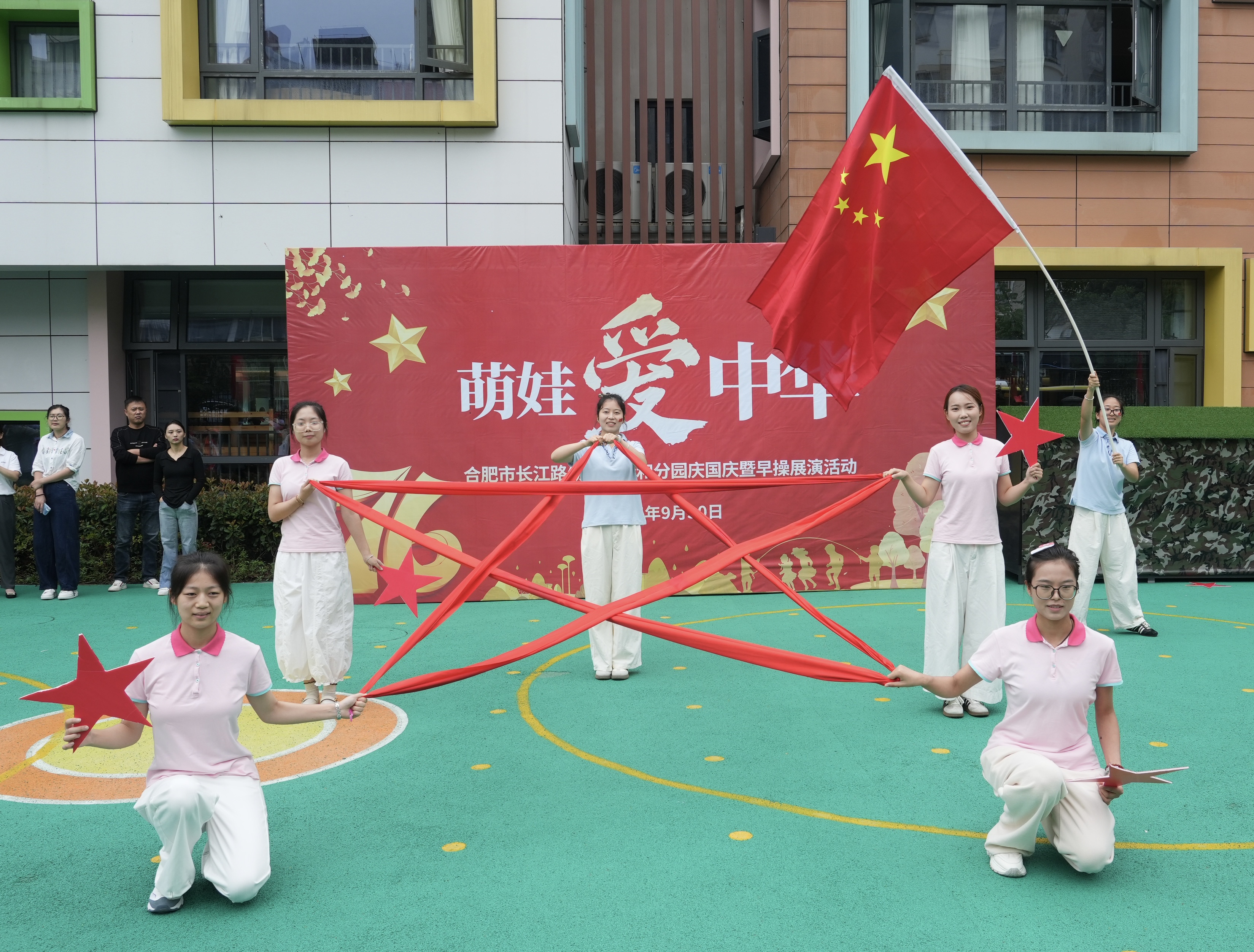 金秋送爽,丹桂飘香,在新中国成立的第76个华诞来临之际,合肥市长江路幼儿园佳和分园紧扣庐阳区“YUE动庐阳 欢乐校园”五大行动精神,于2025年9月30日开展“76华诞,萌娃爱中华”迎国庆早操展演暨家长半日开放活动。活动以“沉浸式体验+亲子互动”为核心,在培养幼儿爱国主义情感的同时,展现师幼蓬勃风貌,共同为“四格”新时代儿童的健康成长赋能,以童真风采为祖国华诞送上诚挚祝福。