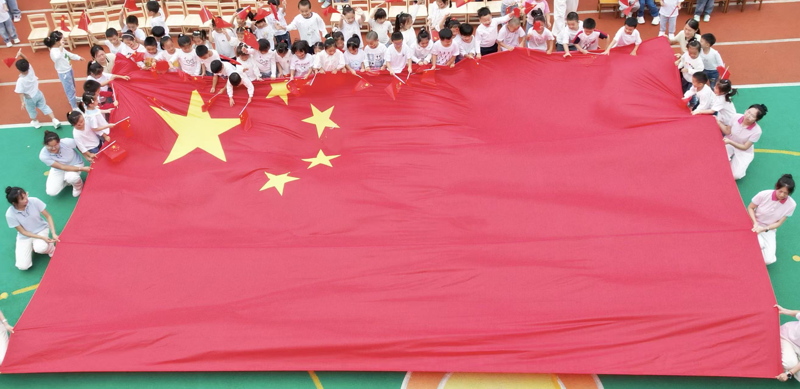 巨大的五星红旗在老师的护送下缓缓“巡游”操场,孩子们轻轻抚摸国旗,眼神里的崇敬与热爱格外动人。