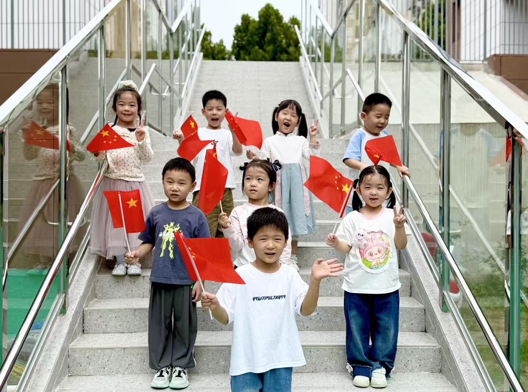 温暖阳光下,孩子们与五星红旗亲密合影。小手中的国旗迎风招展,脸上的笑容比阳光更灿烂。每一张照片都定格着纯真的爱国情,成为孩子们成长中珍贵的“红色记忆”。