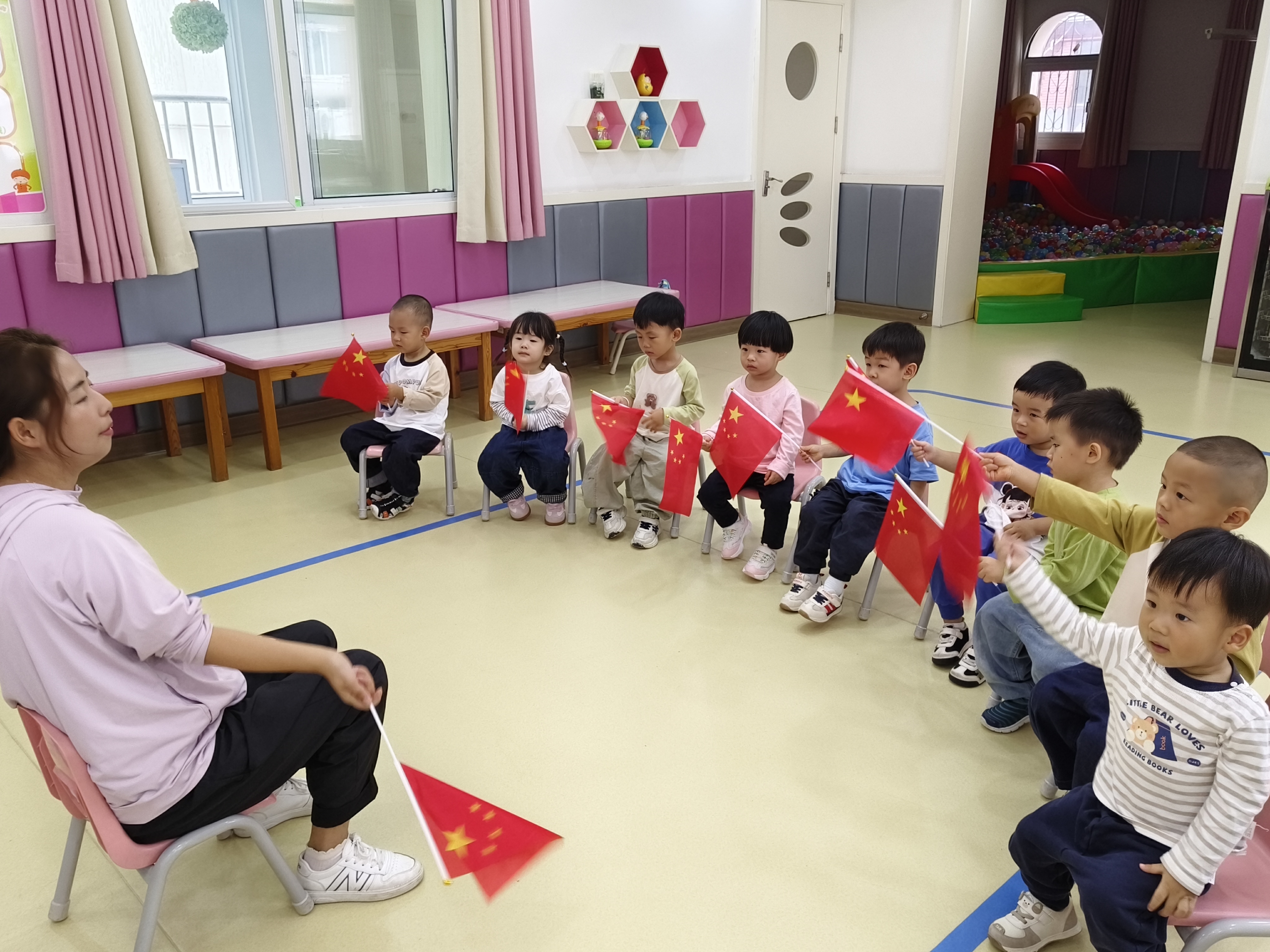 半日托班的宝宝们手举国旗,在老师的带领下排排坐好,当雄壮的国歌旋律响起,宝贝们虽吐字稚嫩,却认真跟着哼唱,小手臂挥动着国旗,红色的旗帜在活动室里汇成一片流动的“星海”,那是宝宝们对祖国最真挚的祝福。