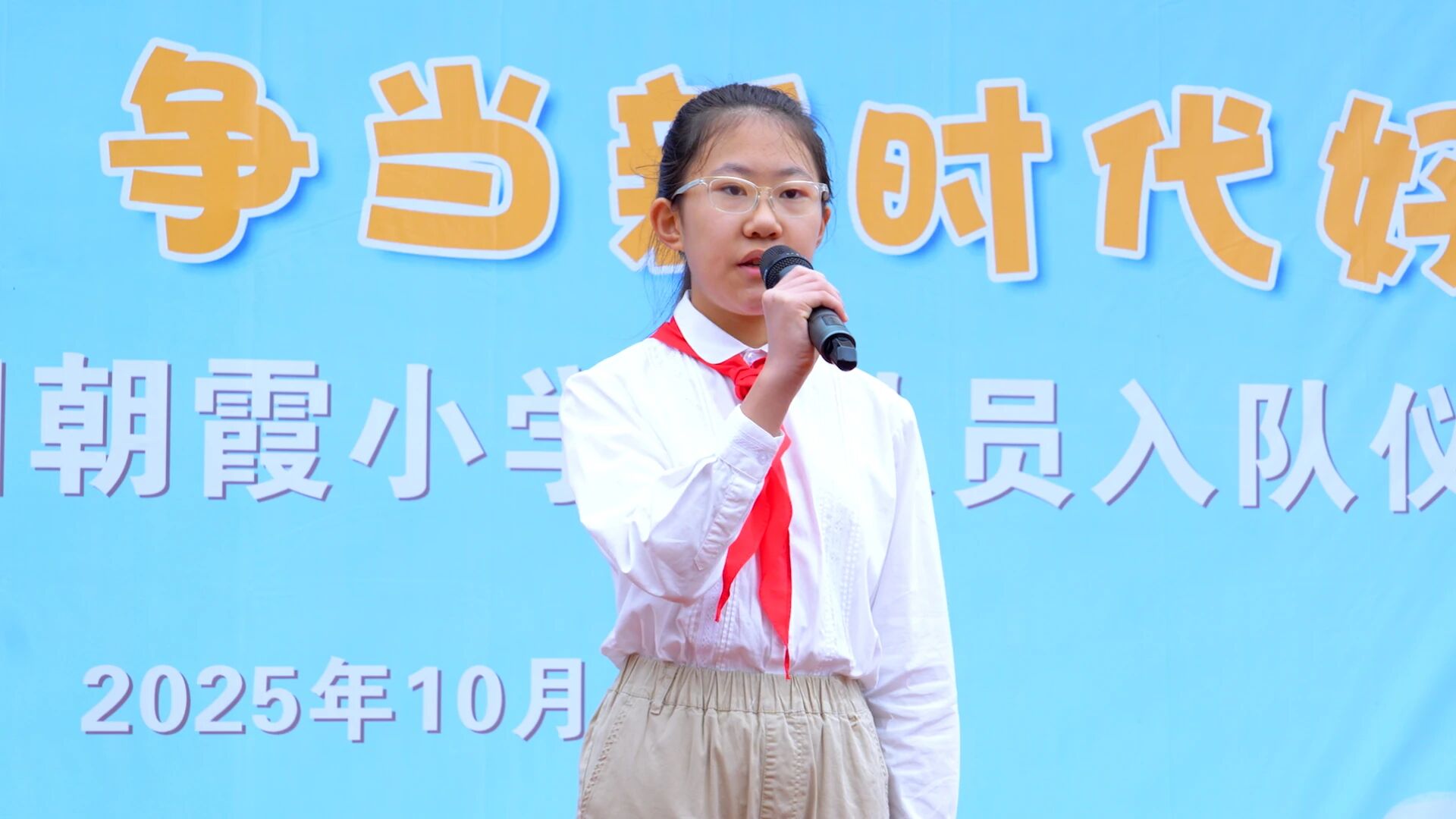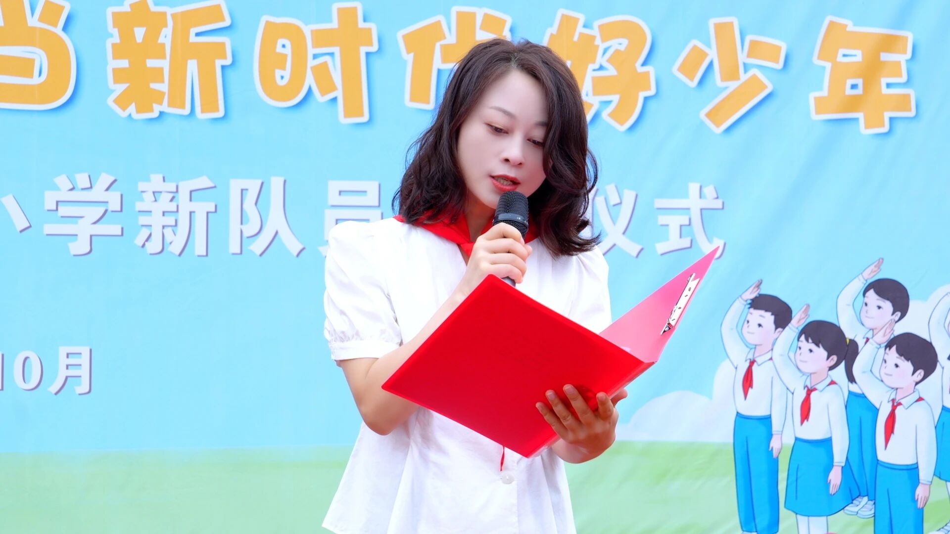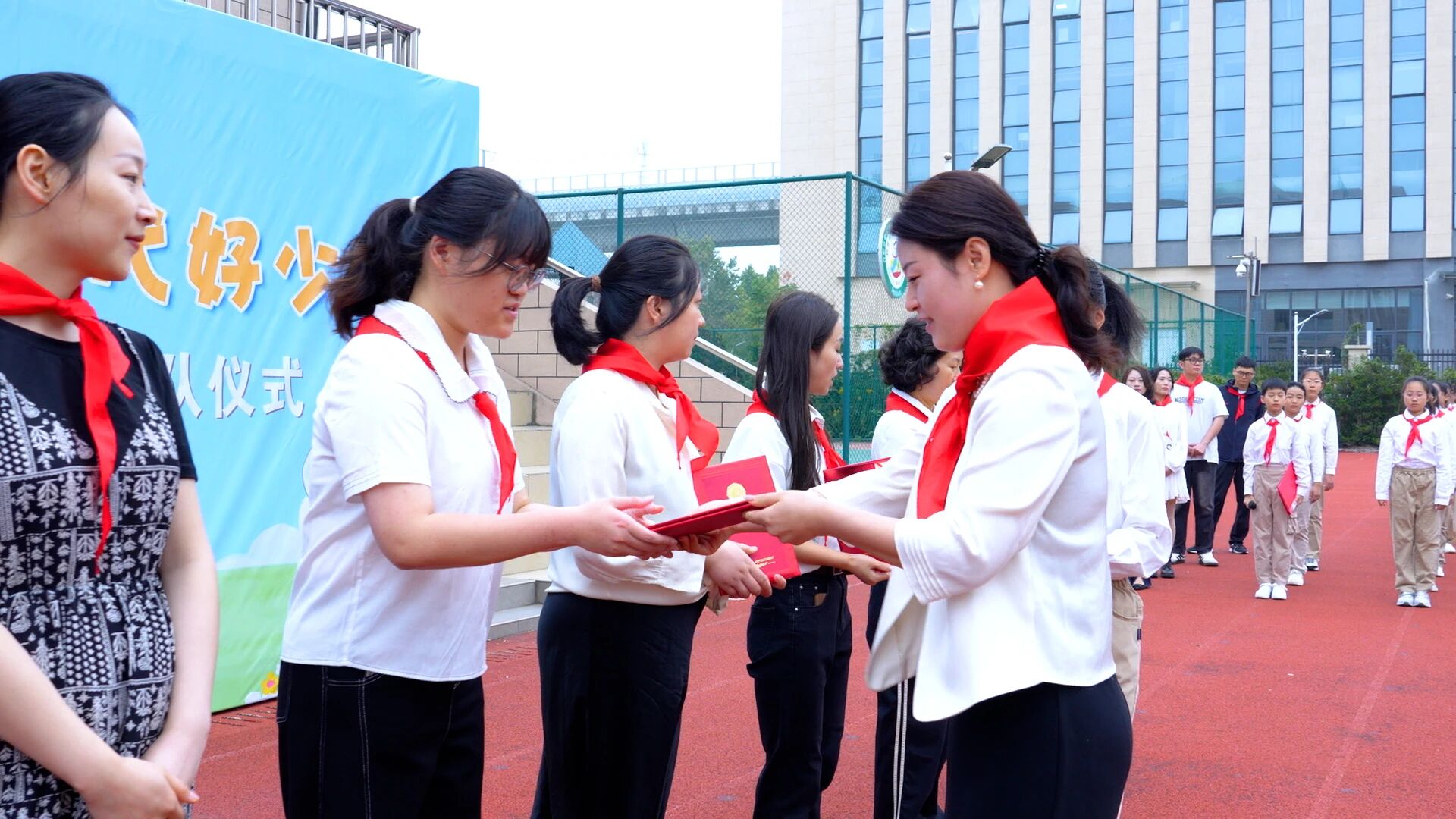 大队长高璇宣读组建新中队的通知,副大队长崔静宜念出新队员代表姓名,新队员们挺直腰背,紧攥红领巾满是期待。
