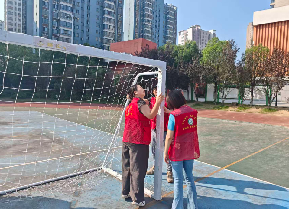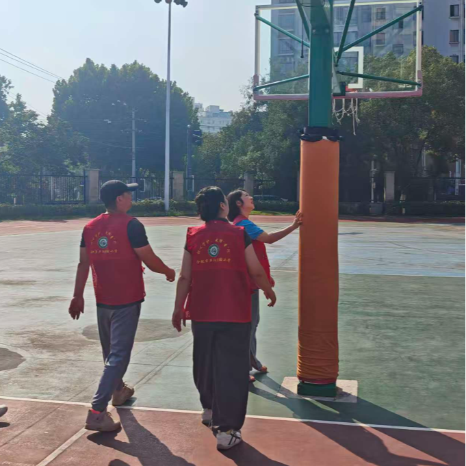 金秋送爽,双节假期圆满落幕,合肥市庐阳实验小学的校园重拾往日的活力,师生们有序回归日常教学与学习生活。为切实筑牢校园安全防线,保障全体师生的生命安全与教学秩序稳定,10月9日上午,合肥市庐阳实验小学党支部书记、校长叶佳,副校长王菁与总务处工作人员、体育组全体教师迅速集结,共同组成专项排查队伍,深入校园各重点区域,开展了一场全面细致的安全大排查行动。本次排查以“消除安全隐患,守护校园平安”为核心目标,在全面覆盖消防设施、食堂卫生等关键区域的基础上,将体育器材专项检查列为重中之重,全体人员步调一致、协同配合,尤其是体育组党员老师主动当先锋,带头冲锋在排查一线,为学生体育课及课外体育活动的安全开展筑牢坚实屏障。