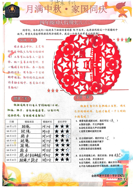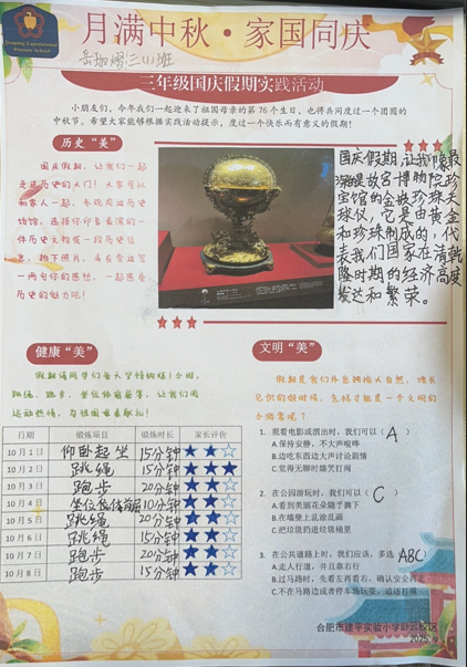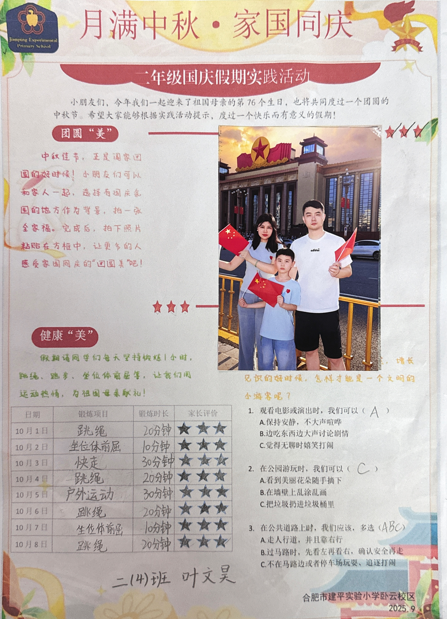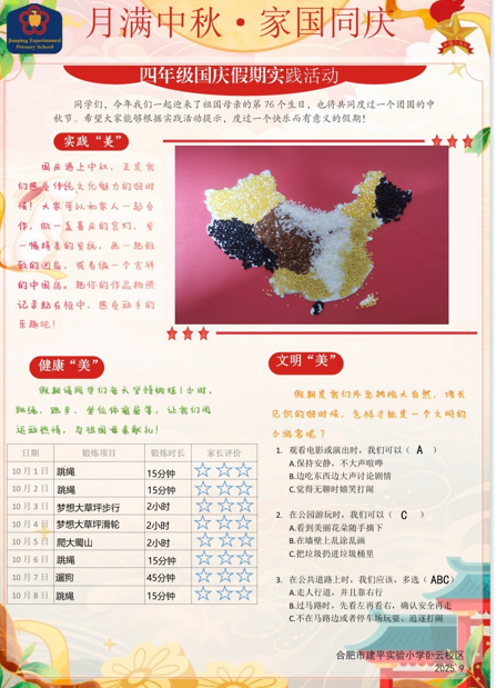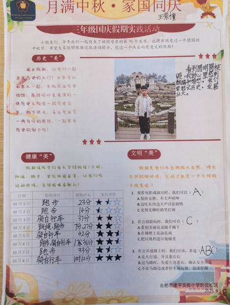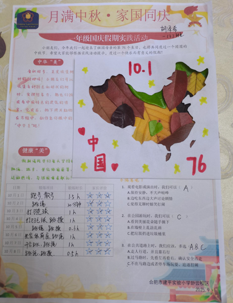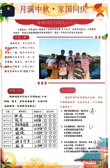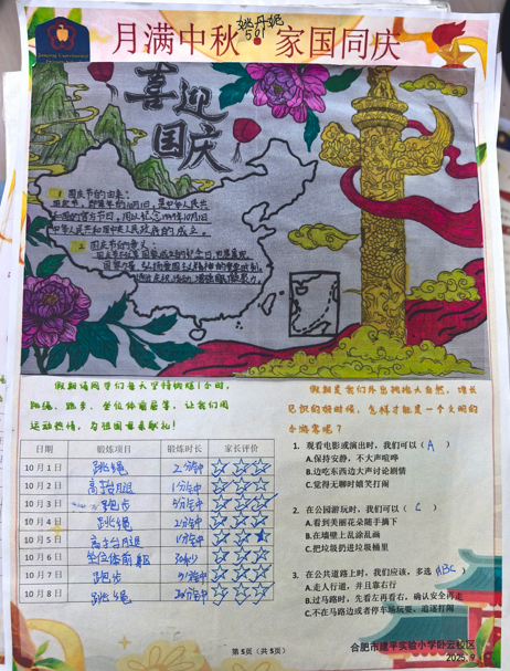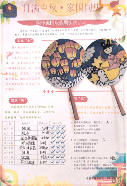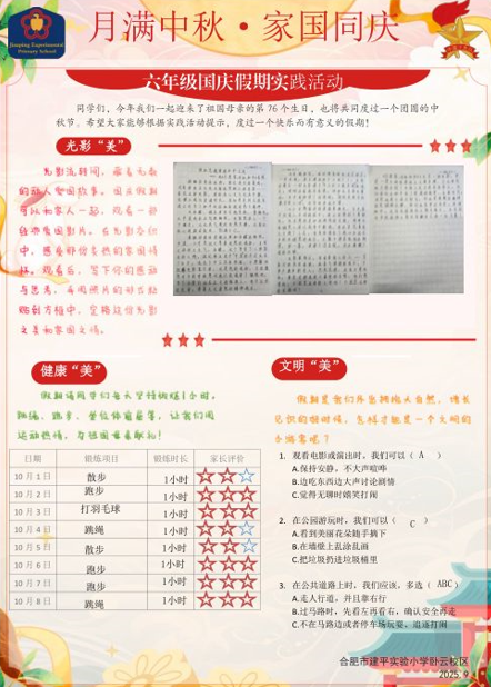 在祖国母亲第 76 个生日与中秋佳节“双节同庆”之际,合肥市建平实验小学卧云校区围绕“月满中秋・家国同庆”主题及美育特色,为一至六年级同学设计了特色国庆假期实践活动。同学们积极参与、用心实践,用丰富的成果展现了对家国的热爱与成长的收获。