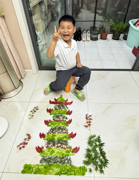 一年级小同学以金秋树叶为创作材料,发挥童真想象力,将不同颜色、形状的树叶拼成各种具有中国特色的建筑图案。通过亲手创作,孩子们直观感受了中华建筑的独特魅力,用树叶拼贴定格了心中的 “中华美”。