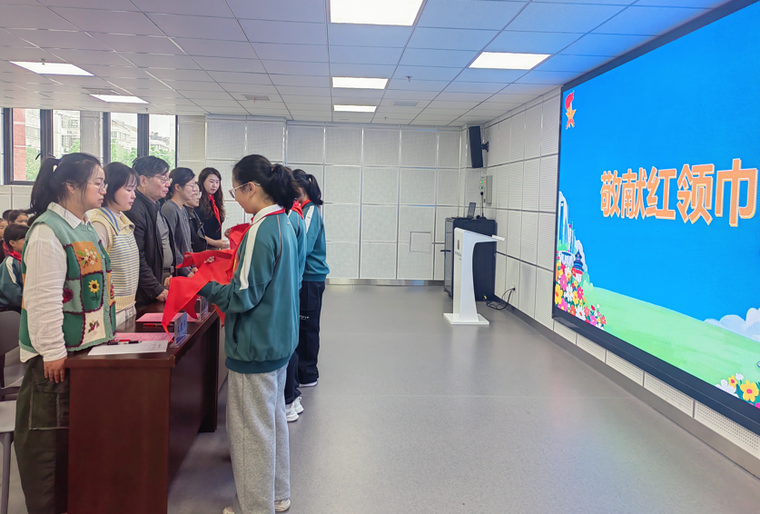 大会伊始,少先队员代表为领导、老师敬献红领巾,仪式庄重;全体起立敬队礼、唱队歌。