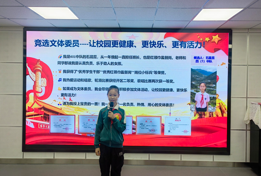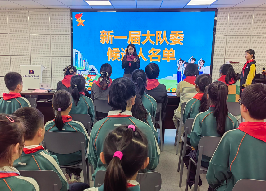 会上,副校长王荣致辞寄望队员,大队辅导员张颖老师宣读大队委候选人名单,候选人演讲答辩展少年风采。