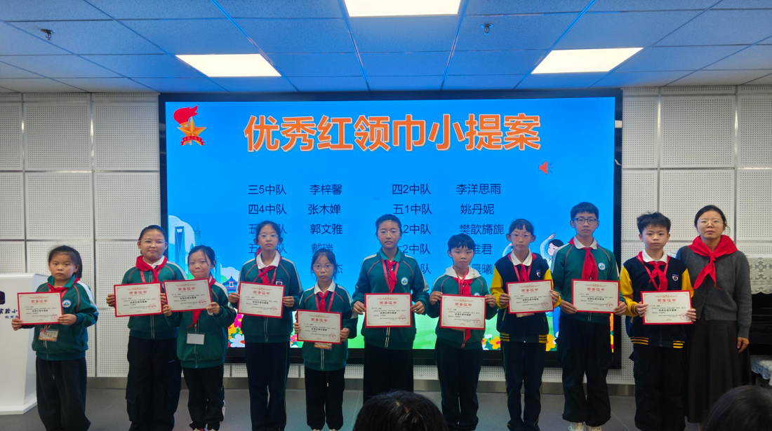 计票过程中,上届大队长蔡恩暖同学代表少先队作工作报告,清晰呈现工作成果与经验。执行校长范辉针对前期收集的红领巾小提案,逐一进行细致解答,切实回应队员们在学习、生活及校园建设等方面的需求与建议。随后,王荣副校长为优秀红领巾小提案获得者颁发证书,并共同合影留念,以表彰队员们的积极参与和创新思考。