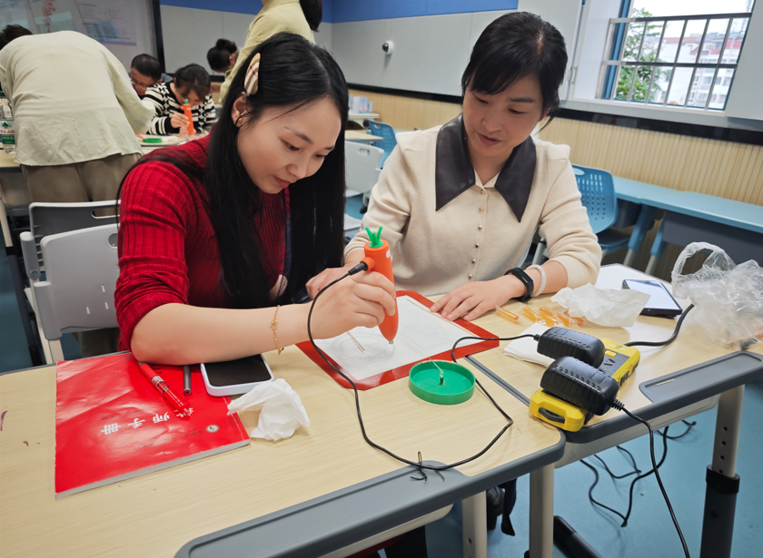 活动在精彩的课堂实践中拉开帷幕。王琪老师执教《制作竹编杯垫》一课,巧妙地将传统竹编工艺引入课堂,引导学生在动手实践中感受劳动之美、匠心之韵,充分体现了劳动教育与中华优秀传统文化传承的深度融合。随后的劳动技能培训环节,吴彩云老师围绕“非遗糖画:甜蜜的民间艺术”展开教学,带领参训教师亲手体验糖画制作,在甜蜜的创造中提升技艺,增强了教师对非遗文化的理解与实操能力。