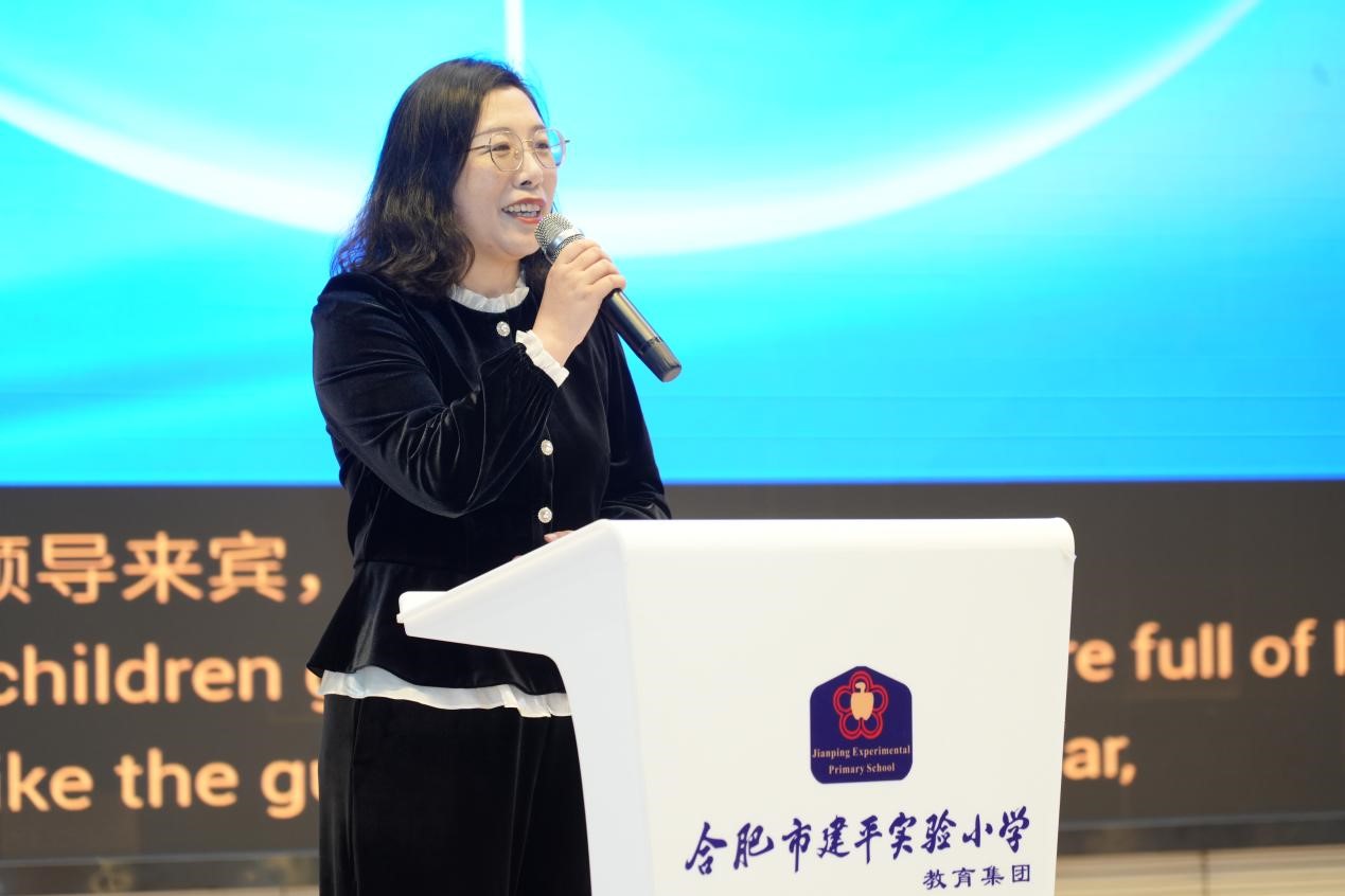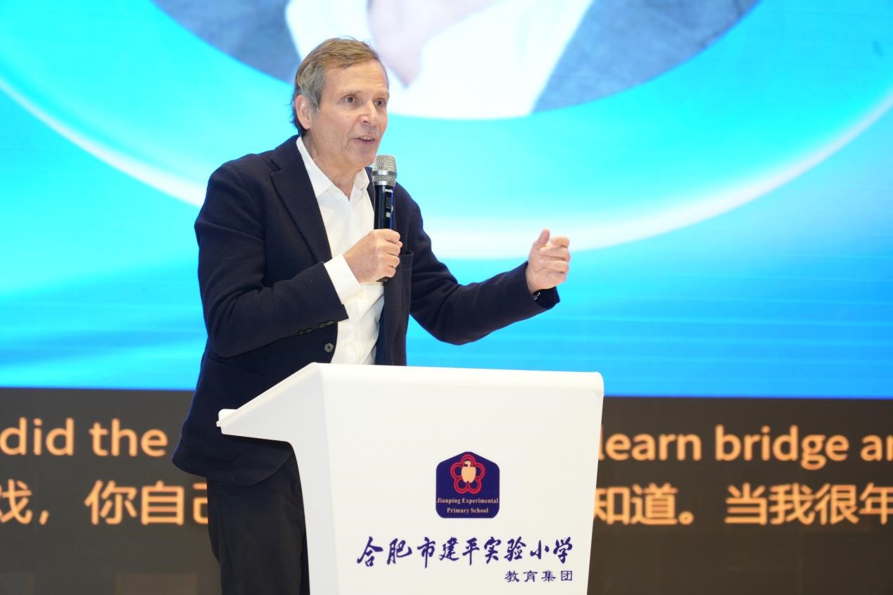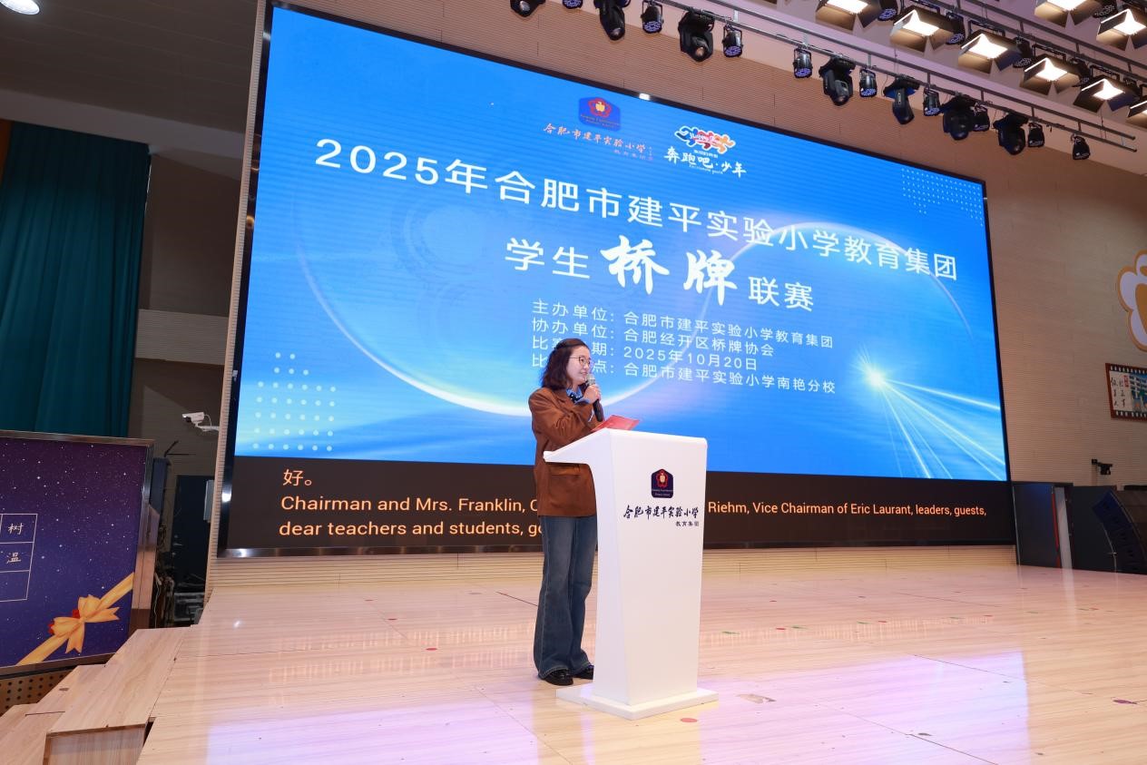 当天上午,恰逢2025年合肥建平教育集团学生桥牌联赛在南艳分校开幕,各校区桥牌社团师生代表齐聚一堂。合肥市建平实验小学党支部书记、校长李梅发表了热情洋溢的致辞,她回顾了集团桥牌教育发展历程,学校近年来深耕桥牌教育并以牌育智、以牌育人,成果斐然,此次国际嘉宾到访,是对学校学生桥牌教育工作的高度认可。