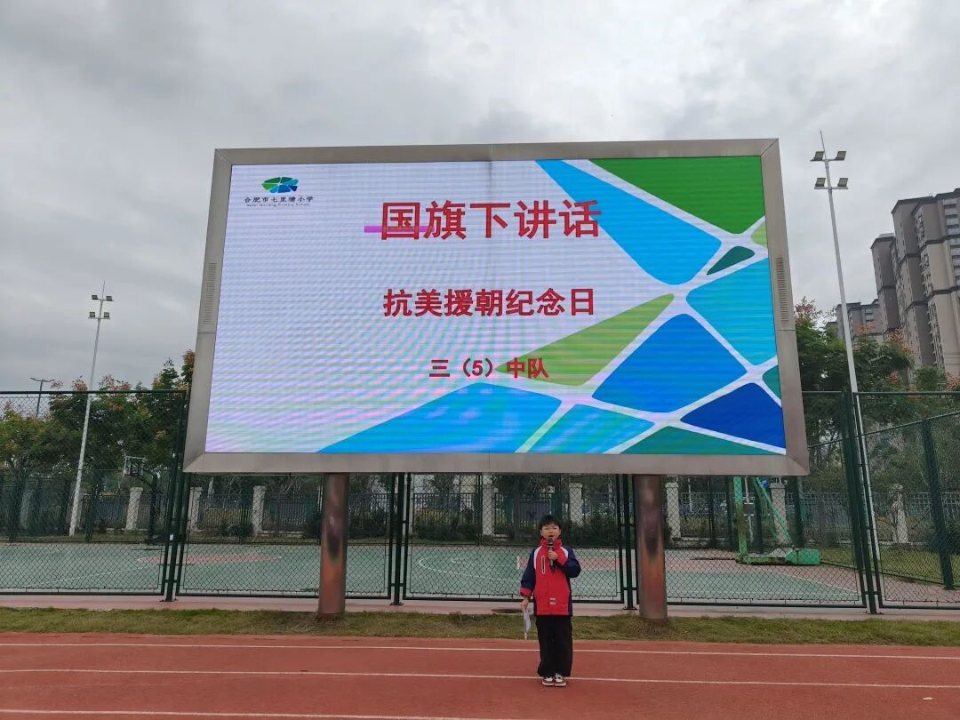 晨光熹微,国旗飘扬。10月20日上午,合肥市七里塘小学全体师生齐聚操场,举行了一场庄严而充满教育意义的升旗仪式。在国旗下,三(5)班陈一凡同学以《致敬英雄,奋斗有我》为主题发表了深情演讲,带领大家回顾了抗美援朝战争中志愿军将士的英勇事迹,号召同学们珍惜和平、砥砺前行。