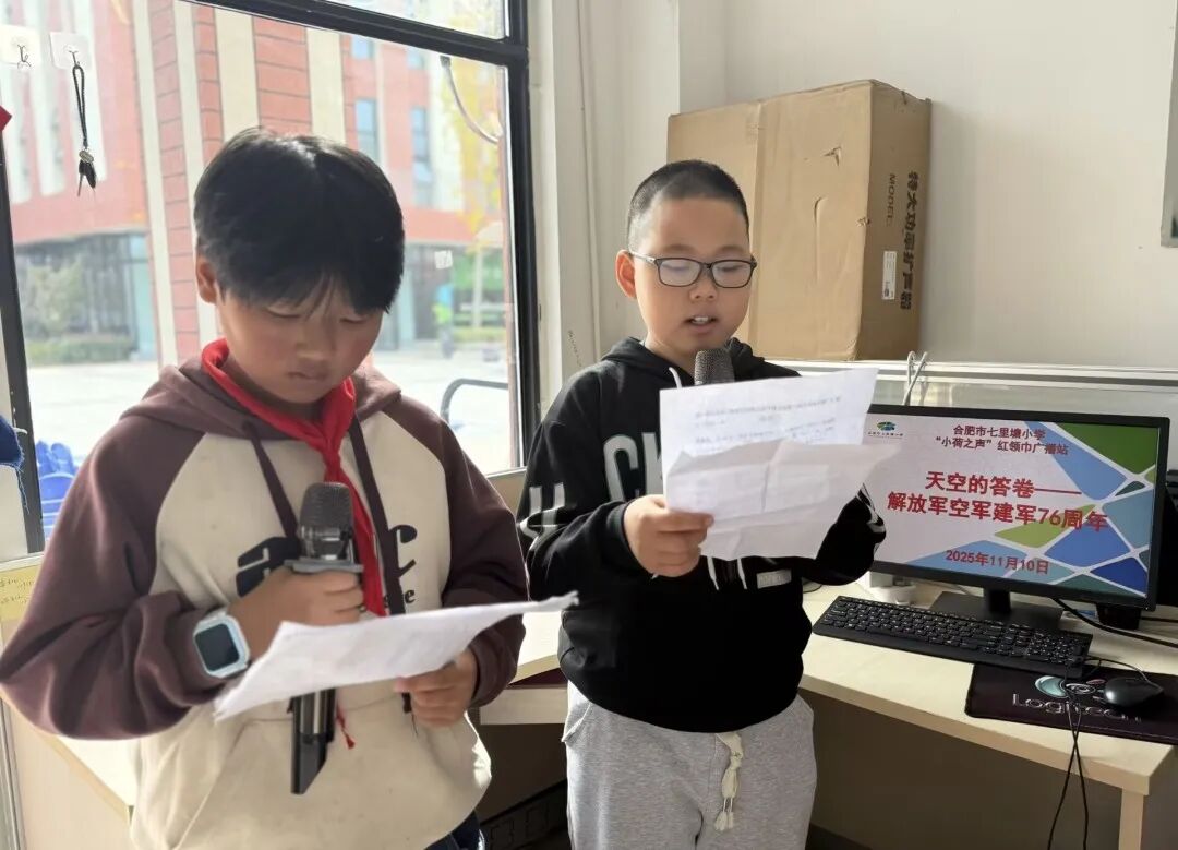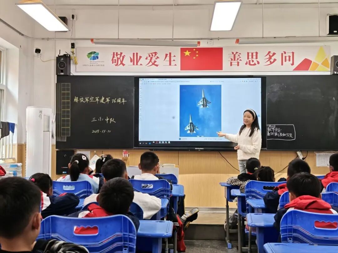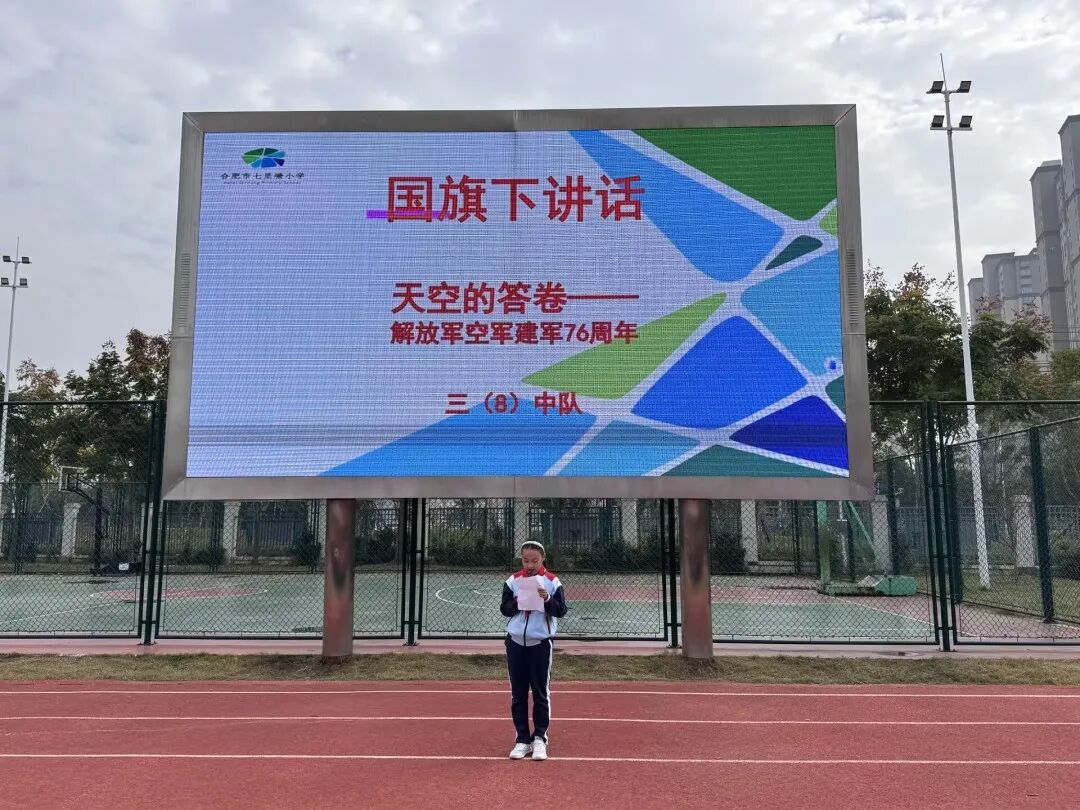 合肥市七里塘小学于11月10日举行了以“天空的答卷”为主题的国旗下讲话活动。本次活动由南区一(2)班陶老师和北区三(8)班学生代表进行演讲,旨在引导全体师生了解空军发展历程,传承和弘扬空军精神。