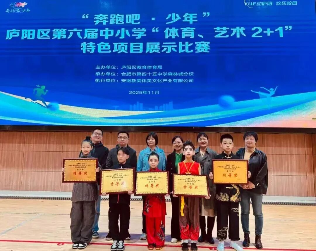 11月6日,由合肥市庐阳区教育体育局主办的“奔跑吧・少年”第六届中小学“体育、艺术 2+1”特色项目展示比赛在合肥市第四十五中学森林城分校体育馆隆重举行。来自全区28所小学代表队展开激烈角逐,合肥市杏林小学参赛项目《炫彩节奏 活力杏林》以扎实的体艺技能、昂扬的精神风貌、自信的现场展示,赢得一致好评,最终以全场第二名的优异成绩获得小学组特等奖。
