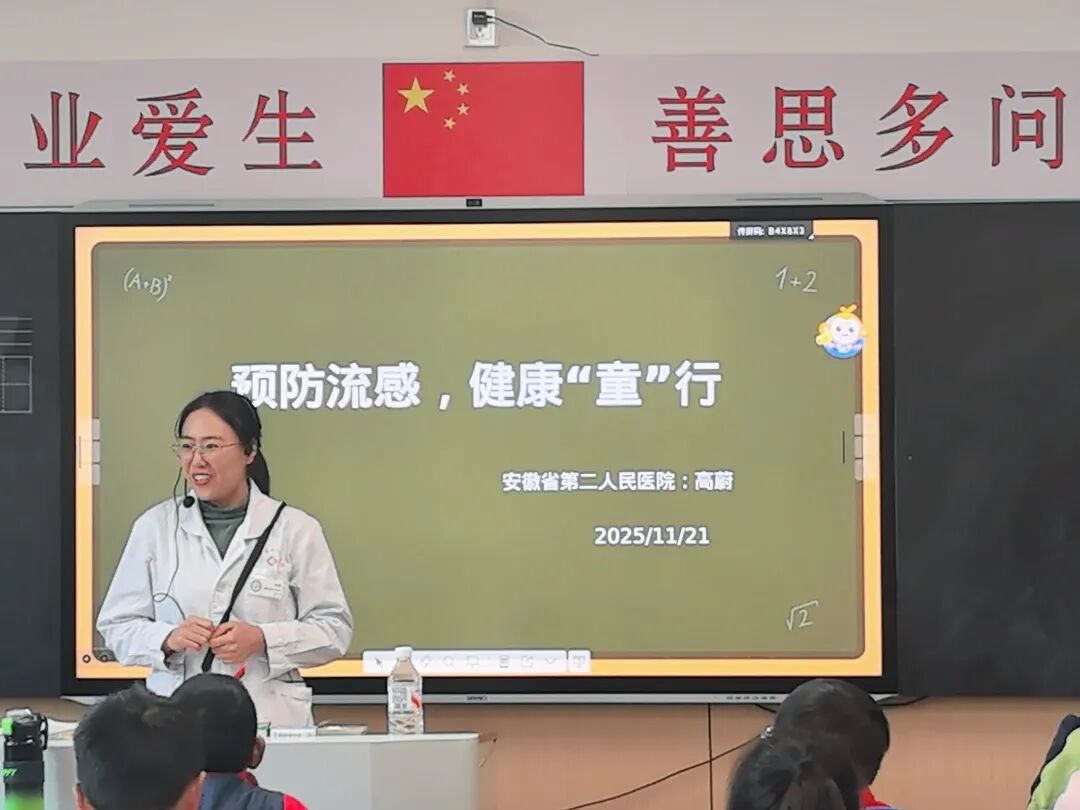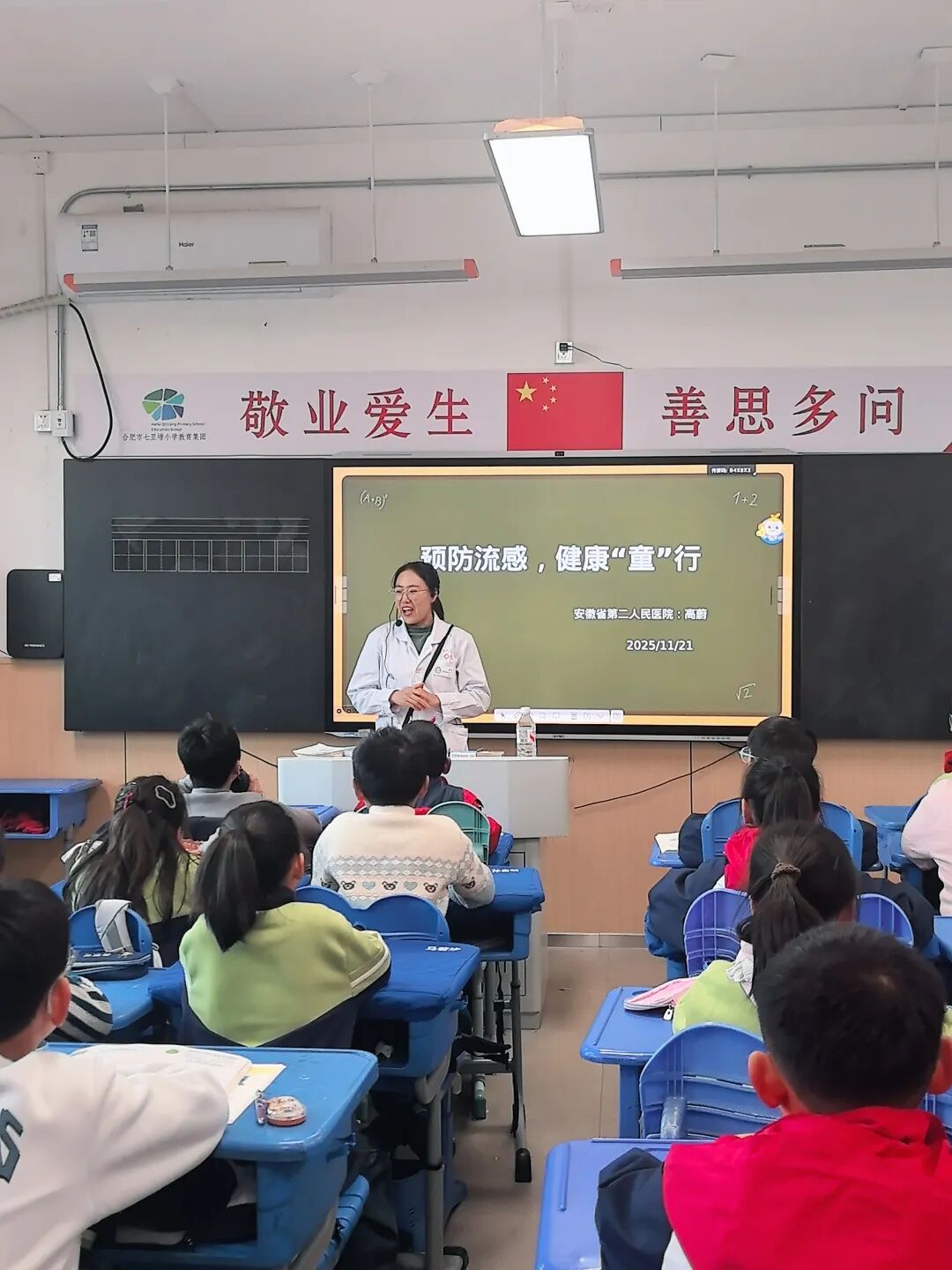 十一月秋冬交替,正是流感高发季节。为增强同学们的疾病预防意识,筑牢校园健康防线,11月21日,合肥市七里塘小学四(5)班开展了“家长进课堂”活动。本次活动特别邀请了李梓萌同学的妈妈——安徽省第二人民医院康复医学科主管护师高蔚女士,她以《预防流感,健康“童”行》为题,为孩子们带来了一堂生动、实用且充满温情的健康知识课。