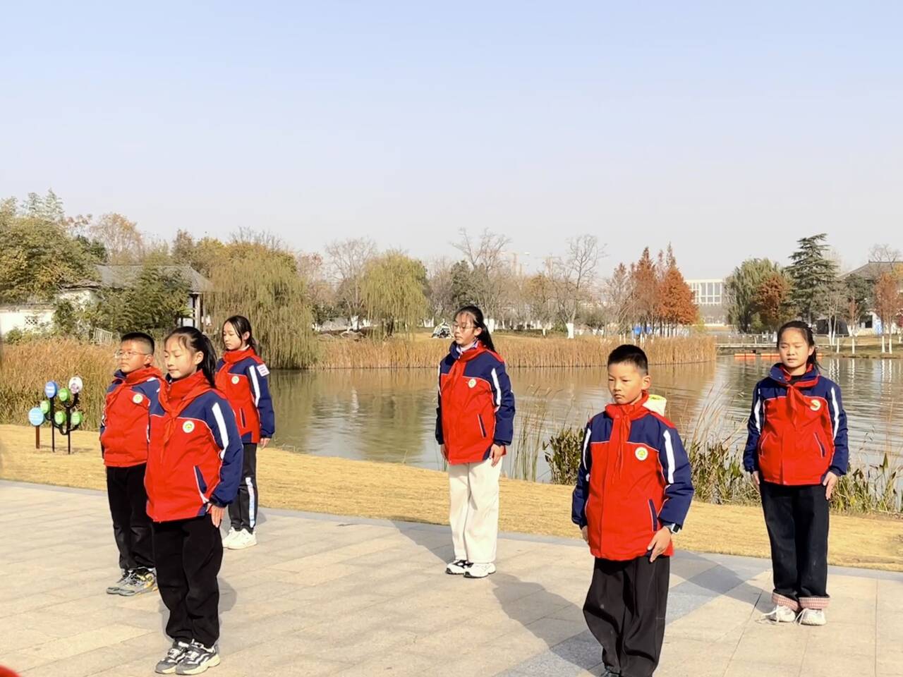 探索环节过后,学校五禽戏队员身着统一服装,在少荃湖畔带来精彩展演。舒展的动作、专注的神情不仅展现了中华传统养生文化的韵味,更吸引了周边游客驻足观看、拍照,成为湖畔一道独特的“校园文化风景线”,也让学生在实践中增强文化自信与集体荣誉感。