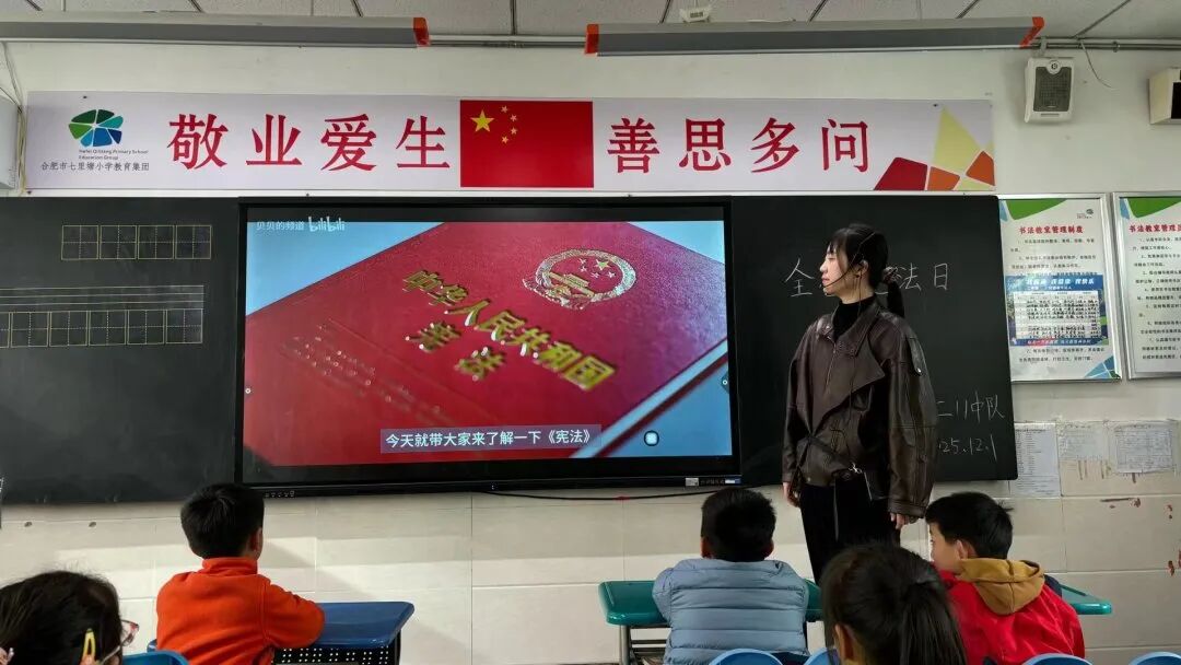 “当五星红旗在晨光中升起时,宪法精神正悄然浸润着校园的每个角落。”2025年12月1日,合肥市七里塘小学以“学宪法·护成长”为主题,通过国旗下讲话与主题班会以及校广播站并行的方式,开展了一场别开生面的宪法教育实践活动。