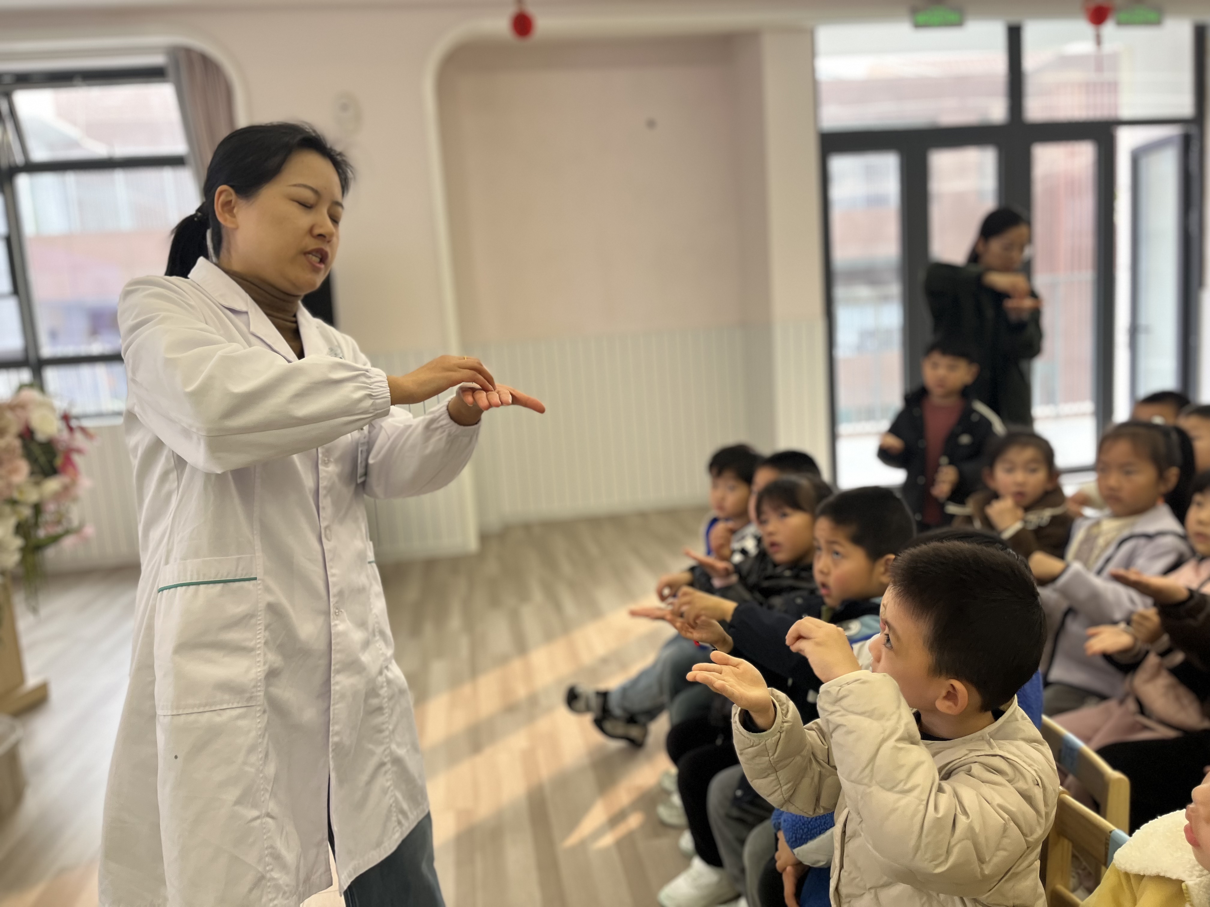为增强幼儿记忆,李医生还创编了流感预防顺口溜,带领孩子们齐声朗读,并现场示范“七步洗手法”。孩子们积极参与,在互动中掌握了基本的卫生防护技能。