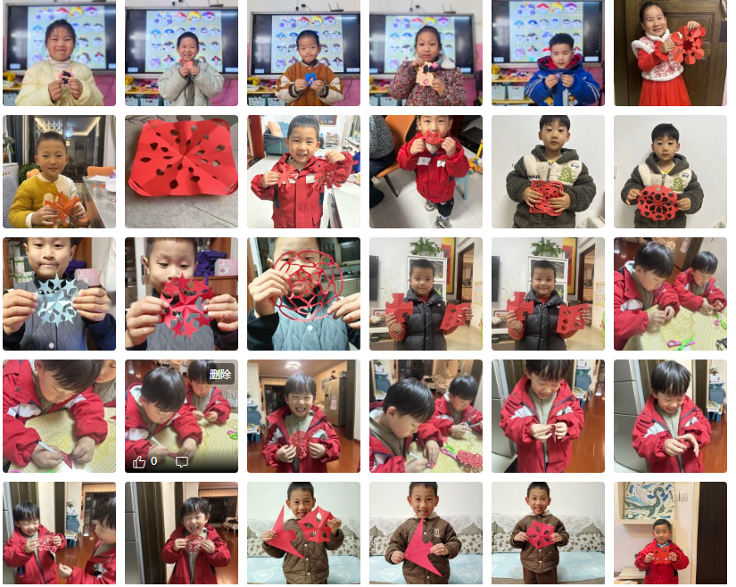 为延伸学习体验,班级鼓励幼儿与家长共同创作窗花,既增进了亲子情感,也加深了幼儿对剪纸技艺的理解。活动最后,孩子们将亲手制作的窗花张贴在教室玻璃上,为班级营造出温馨喜庆的元旦氛围。阳光下,红色的窗花映出斑驳光影,映照着每一张充满成就感的笑脸。