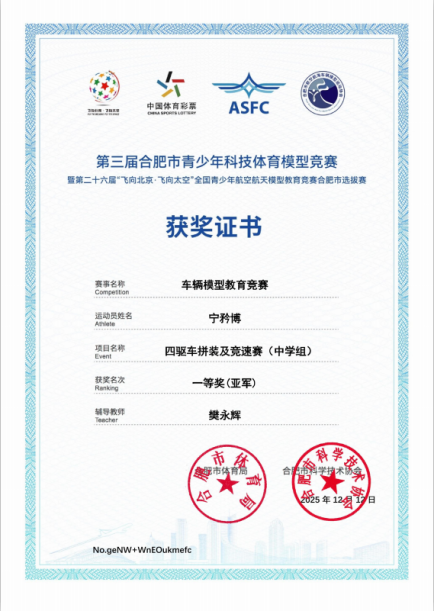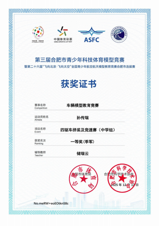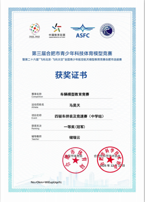 在车辆模型竞赛中,该校学生表现尤为突出:七8班马昊天夺得冠军,七4班宁矜博获亚军,八7班孙传瑞获季军、八12班胡磊、七4班洪玥凡获一等奖;八6班邓辰旭、八7班张浩然、八7班黄子轩、八7班方子恩获二等奖;七6班张可欣、八6班赵龙俊、八6班赵思绮、八1班张爱祺获得三等奖,七2班李学刚、七12班郭其征、七4班陆梓菡、八5班高雨馨、八1班彭晓勇获优秀奖。
