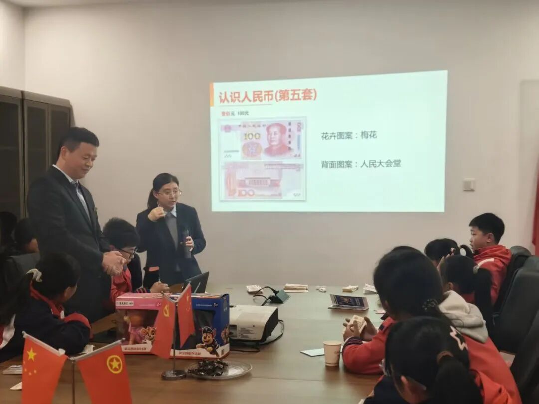 认识人民币环节里,大家细致学习防伪标识的识别技巧,认真观察不同面值纸币上的花纹图案,不时举手提问、分享发现。
