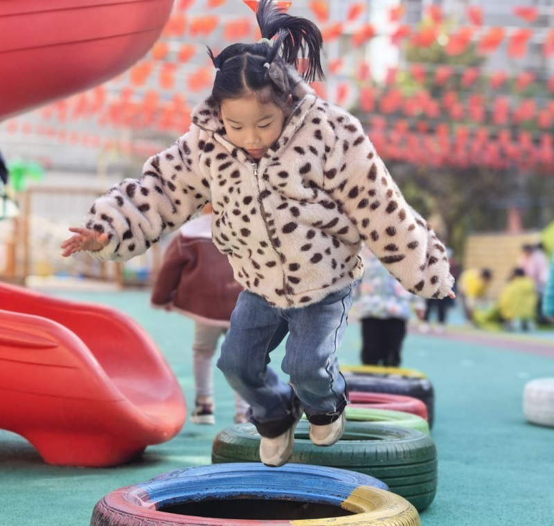 在跳跃项目中,孩子们从基础跳圈开始,逐步挑战彩虹栏杆和轮胎跳跃,动作从生涩到娴熟,展现出良好的身体协调能力。投掷项目中,孩子们从投“山洞”起步,逐步攻克九宫格和龟背投掷,在反复尝试中提升精准度与专注力。