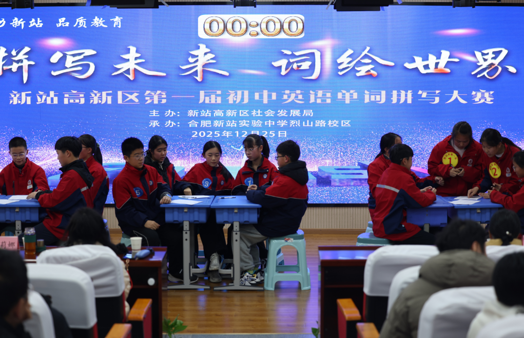 字母传韵,拼写竞辉;少年意气,逐梦词海。2025年12月25日,合肥新站高新区第一届初中英语单词拼写大赛在合肥新站实验中学烈山路校区圆满落幕。本次大赛以“拼写未来 词绘世界”为主题,由区社会发展局主办,吸引了全区各中学的优秀学子积极参与,分七年级与八年级两个专场展开角逐。
