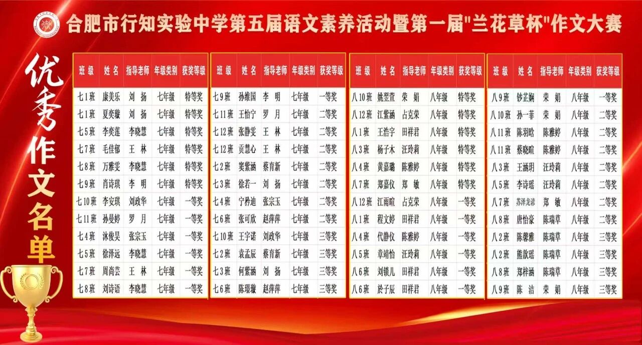 为进一步营造书香校园的浓郁氛围,有效提升学生的语文素养与写作能力,合肥市行知实验中学于近日成功举办了第五届语文素养活动暨第一届“兰花草杯”作文大赛,并顺利完成评选工作,举行了隆重的颁奖仪式。本次活动由学校语文教研组统筹策划,教务处协同支持,旨在通过写作实践弘扬中华优秀传统文化,推动语文教学与育人实践深度融合。