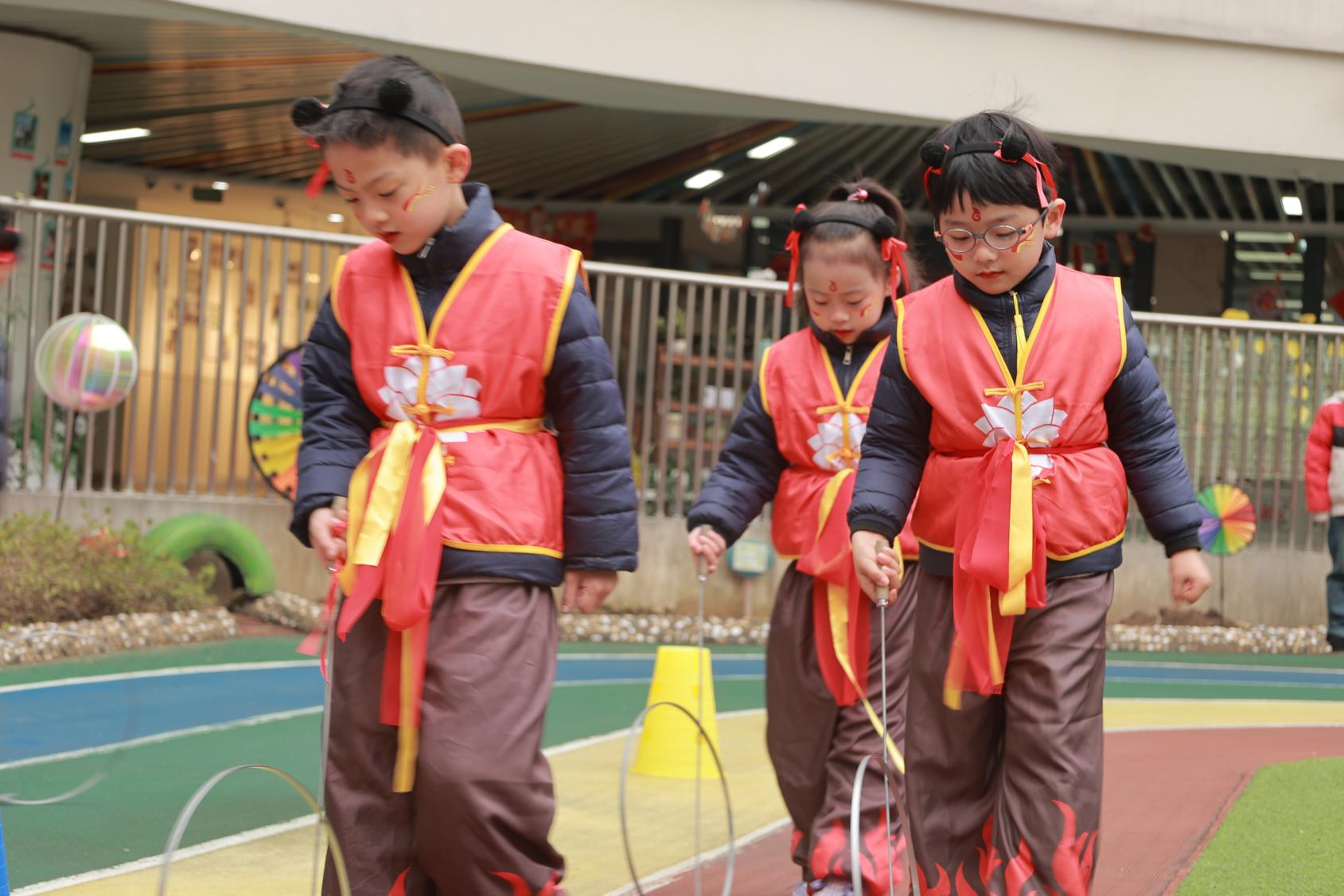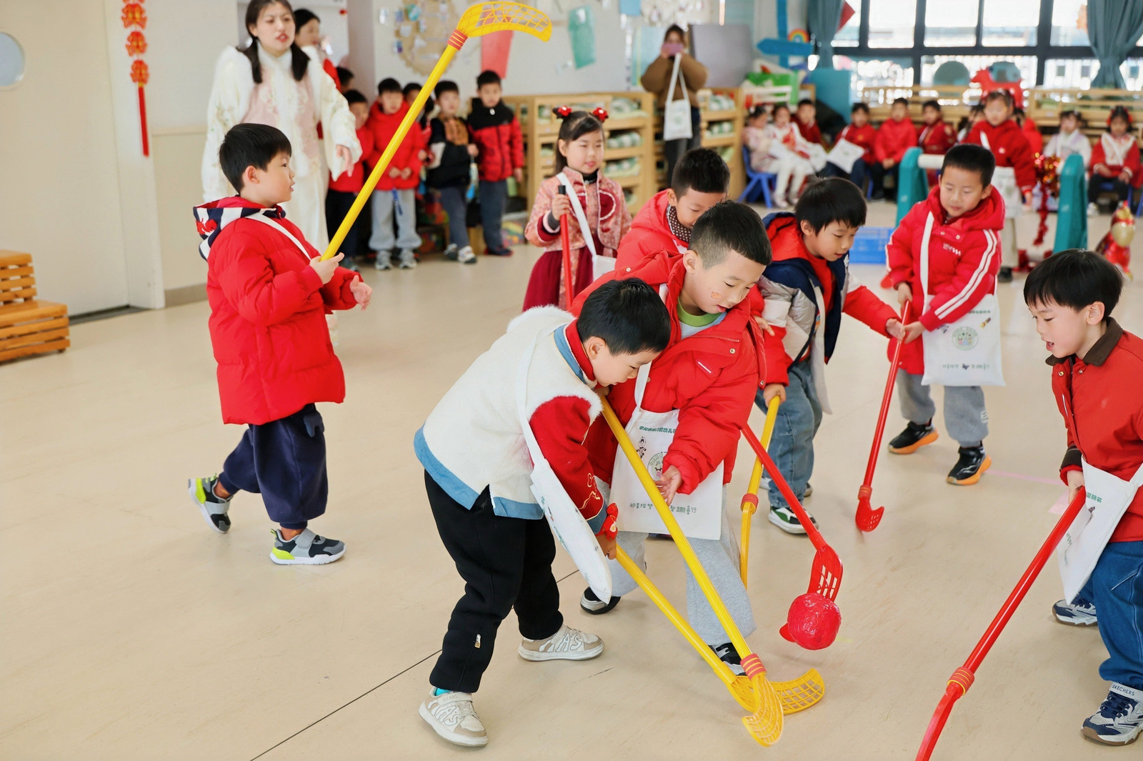 大班组十个班级同步进行传统游戏阵地,萌娃们串班闯关,开启文化与趣味兼具的新年之旅。“迎新接福 马上如意”里,孩子们执笔写下新年心愿;“古韵捶丸,喜迎新年”让传统球类运动“活”起来,孩子们沉浸式体验非遗乐趣;“童欢启新,马到成功”的障碍赛道上,孩子们跨越挑战收获成就感;“蒙眼觅福,元旦奇旅”“勇打年兽,乐寻福记”“马跃福门,鱼拓祥年”等游戏,将非遗文化、年俗传统与趣味挑战巧妙融合,充分展现了孩子们的活力与创造力。
