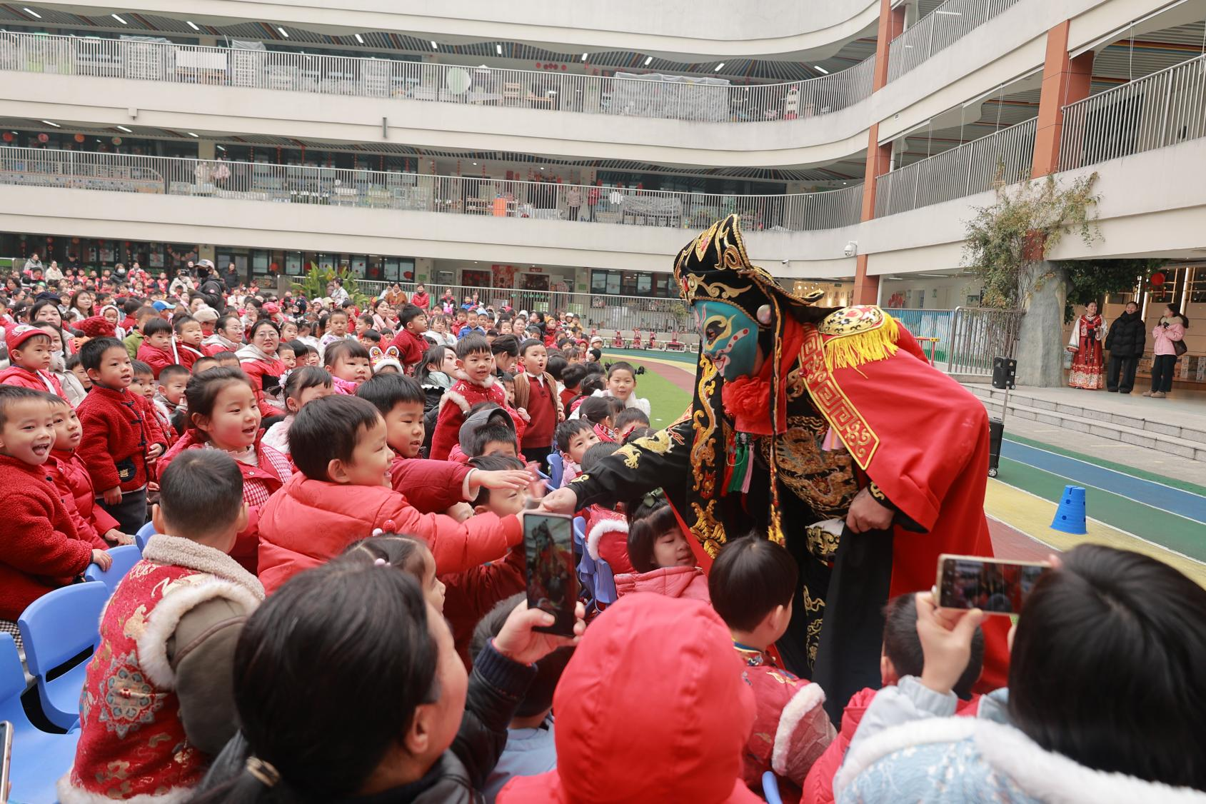 随后,精彩表演点燃全场:舞狮随鼓点跳跃互动,孩子们或好奇观望或大胆触摸;变脸演员快速变幻红、蓝、黄、绿等脸谱,还走到孩子中间递上红色福袋,引得大家欢呼雀跃。此外,大班哥哥姐姐的滚铁环展示格外吸睛,熟练的动作让弟弟妹妹们纷纷点赞。