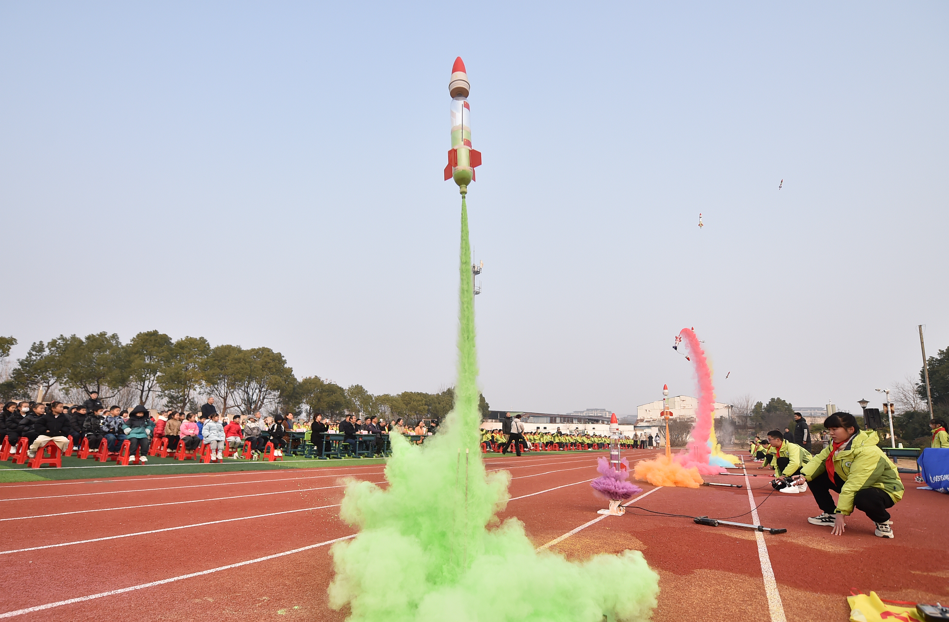“科创逐梦”篇章强势接档,直接点燃全场激情!科学社团的五、六年级同学带来的水火箭发射表演堪称视觉盛宴——随着庄严隆重的倒计时“3、2、1——发射!”,一个个色彩鲜艳、造型别致的水火箭裹挟着水汽呼啸升空,仿佛要带着孩子们的科学梦想飞向天际。