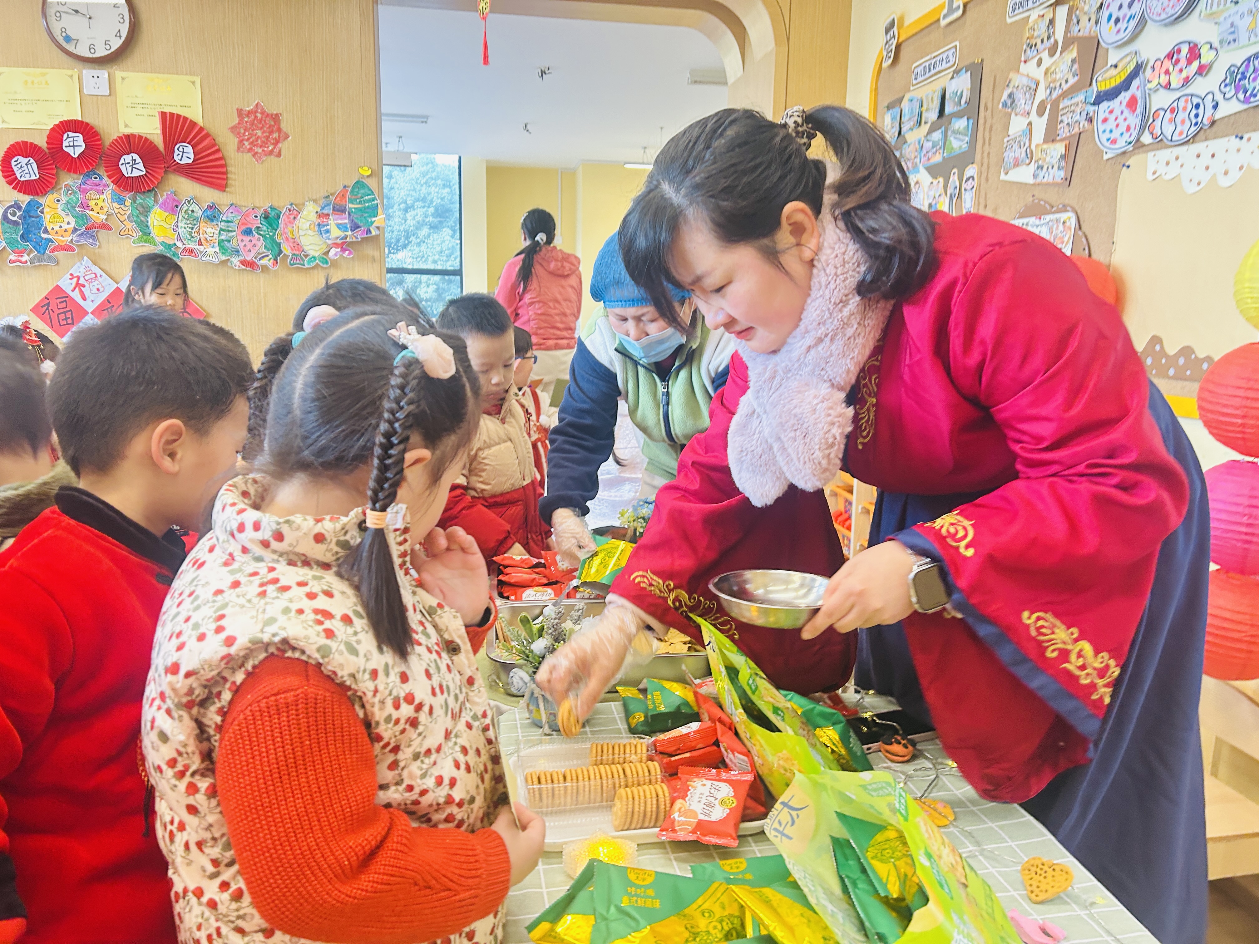 活动室里划分出创意制作区、趣味游戏区、饼干品尝区、暖心饮品区等不同区域,指示牌醒目亮眼。创意制作区里孩子们用多彩黏土制作各种饼干,孩子们创意满满,制作的饼干新奇有趣,造型各异。趣味游戏区里的“吸福气”“抢椅子”“猜灯谜”等项目,吸引着全园孩子们的参与挑战,大家在老师的引导下遵守规则、大胆尝试,每完成一项游戏,就能收获一枚奖励贴画,脸上洋溢着满满的成就感。饼干品尝区内,各类饼干琳琅满目,孩子们拿着集满贴画的卡片兑换美食后,在指定区域小口品尝,还不忘与小伙伴分享美味。暖心饮品区里,老师早已备好香甜的水果茶和热豆浆,孩子们和同伴一起碰杯,香甜的饮品瞬间驱散了寒意,带来了温暖。