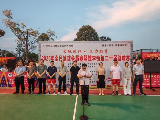 姚李镇党委副书记、镇长刘洋同志代表镇党委、政府发表热情洋溢的致辞。他高度肯定了全民篮球赛二十年坚守在丰富群众文体生活、凝聚基层精神力量方面的重要作用,并对所有参赛者、组织者及支持单位表达了诚挚谢意与美好祝愿。随后,镇党委书记沈忱同志郑重宣布:姚李镇第二十届全民篮球争霸赛正式开赛!