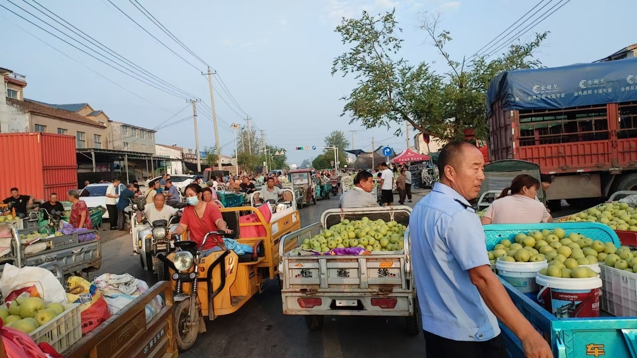 这时,一抹抹藏青身影踏着晨露出现了——赵屯镇综合行政执法队的队员们,成了这场丰收交响里的“指挥家”。他们比朝阳更早唤醒街道,在薄雾中拉起临时警戒线,将交易区与通行道细细分开:这边引导果农把满载梨子的三轮车停进划定区域,那边挥手示意收购货车错峰停靠,遇到占道的商贩,便笑着递上一句“挪挪地儿,路通了买卖更顺”。