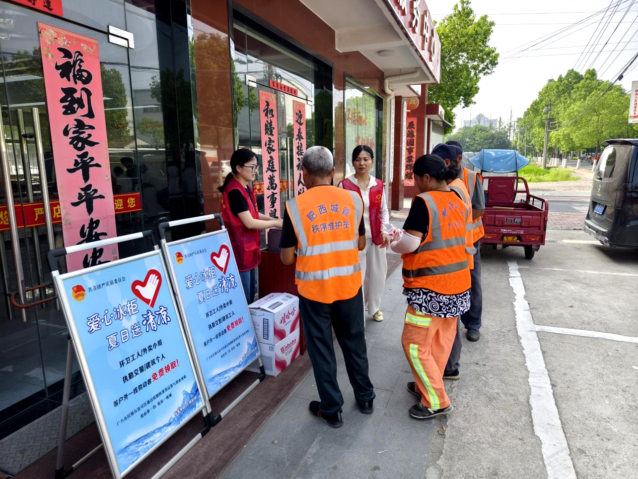烈日炙烤下的城市热浪滚滚,户外工作者们仍在坚守岗位一线。严店镇团委在严店社区街头设置了爱心驿站,安装了爱心冰柜,“夏天户外工作您辛苦了,喝瓶水吧!”志愿者们看到户外工作者,就招呼他们到爱心冰柜取水。一句简单的暖心话语,让连日来的高温一线工作人员感受到来自共青团的温暖与关爱。