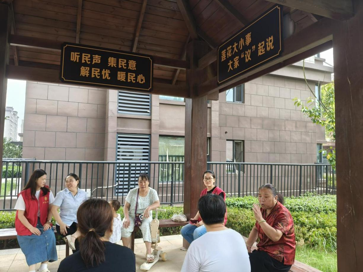 为了更贴近群众、倾听心声,莲花村“莲心聚慧”妇女议事会将议事场所从办公室搬到了户外议事亭,轻松自在的氛围让大家畅所欲言。搬进新居不易,改变旧习更难,刘河幸园小区公共空间,尤其是供大家休闲健身的户外场所,堪称邻里交往的客厅、健康生活的乐园,因此,其整洁与安全至关重要。大家聚焦小区内公共区域杂物堆积、环境维护难等居民的“心头堵”,展开了热烈而务实的讨论。宝贵的意见和接地气的想法不断涌现:有人提议以身作则带头清理,有人强调暖心沟通入户劝导,更有“小手拉大手”的巧思,提议发挥孩子们的作用。议事亭内,妇女们围坐交谈、笑语晏晏,开放议事、集思广益的模式成效初显。